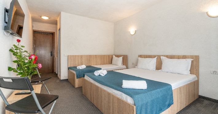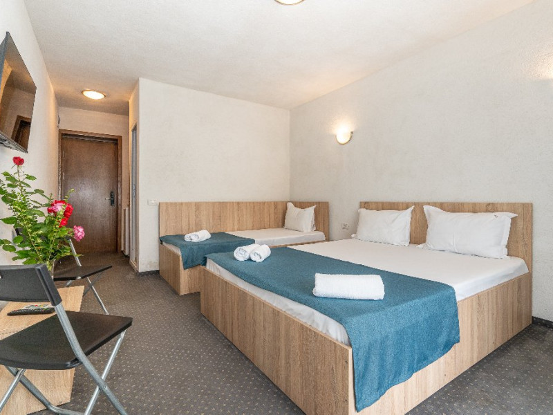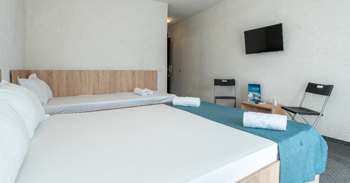 Camera Tripla matrimoniala are un pat matrimonial (160/200 cm) si un pat individual ( 100/200 cm). Recomandare: Camera tripla este destinata cazarii a 2 adulti si 2 copii sau a 3 adulti. Dotari: sistem de acces in camera pe baza de cartela/cod de acces, aer conditionat, TV LCD, seif, baie cu cabina de dus, cosmetice hoteliere, balcon cu mobilier de terasa pentru camerele situate la etaj.