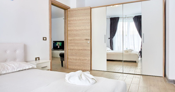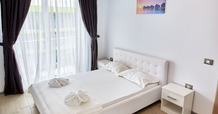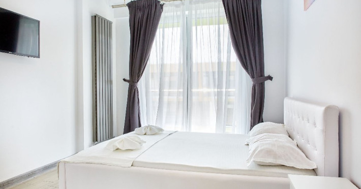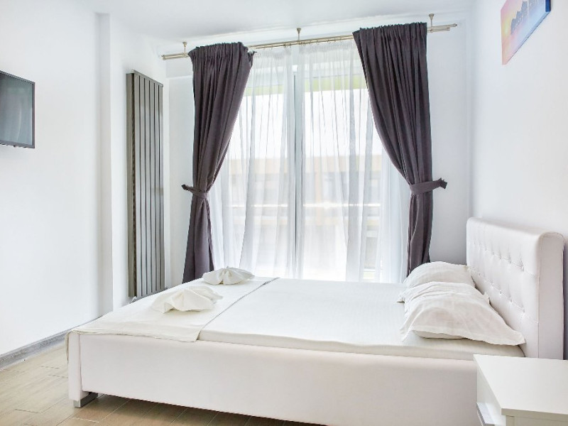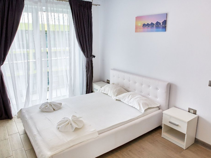 Apartament Iris Alezzi Va propunem spre inchiriere un apartament deosebit, in Complex Alezzi, cel mai mare complex resort din statiunea Mamaia Nord. Apartamentul Iris va ofera confortul mult dorit si un sejur perfect la malul marii. Apartamentul Iris este decomandat, format din 2 camere spatioase, living, dormitor baie si bucatarie. Datorita spatiului generos pe care acesta il are, capacitatea de gazduire fiind de 4 persoane, deoarece in dormitor se afla un pat matrimonial iar in living o canapea extensibila. Bucataria este mobilata si utilata punand la dispozitia clientilor sai o gama larga de electronice de cea mai buna calitate: masina de spalat rufe, cuptor si plita electrica, cuptor cu microunde si filtru de cafea. Proprietatea are aparat de aer conditionat, precum si TV cu o diagonala de 140 in living si TV in dormitor de 110, cu o gama variata de posturi . Oaspetii nostri au acces nelimitat la internet prin wi-fi de mare viteza, electrocasnice, apartamentul fiind dotat cu tot ce este necesar. Zona Mamaia Nord de-a lungul timpului s-a dezvoltat foarte mult, astfel ca in acest moment a devenit cea mai cautata statiune turistica de pe litoralul romanesc. In zona gasiti o diversitate de restaurante, cu specific diferit, terase,baruri,cafenele,gelaterii,magazine,farmacii,etc. Intr-o arie de 500m gasiti mai multe plaje (astfel, va puteti alege zona unde doriti sa va petreceti ziua relaxant si sa va bucurati de soare). Cumparaturile sunt usor accesibile. Deasemenea cluburile sunt la o mica distanta de proprietate. Turistii beneficiaza de urmatoarele facilitati gratuite ale complexului: sala de fitness, spa, sauna umeda si uscata, piscine in aer liber pentru adulti si pentru copii,jacuzzi,loc de joaca pentru copii. Proprietatea este ideala ca apartament de vacanta, avantaj ce poate fi tradus prin privelisti spectaculoase de la rasarit pana la apus, prin libertatea de a practica sporturile nautice preferate sau prin bucuria de a avea plaja in apropiere.