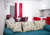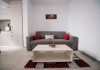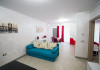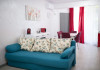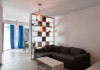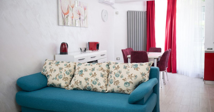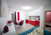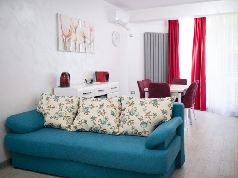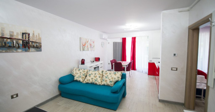 Apartamentul Relax 1 din complexul Alezzi impresioneaza prin combinatia de albastru si rosu care domina amenajarea. Sufrageria open space este centrata in jurul unei canapele extensibile de culoare albastra, ce invita la relaxare. In fata acesteia, un televizor modern este strategic amplasat pe un mobilier alb cu accente rosii, creand un contrast atragator.