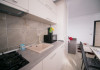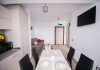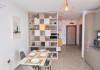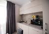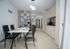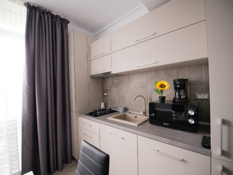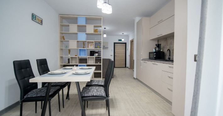Bucataria apartamentului se integreaza perfect in ambientul sufrageriei, avand dotari moderne care imbina functionalitatea cu estetica. Aceasta este echipata cu un aragaz modern, cuptor cu microunde ,frigider spatios, hota. Mobilierul in culori deschise ofera suficient spatiu de depozitare si de lucru, iar blatul de lucru este usor de intretinut. Zona de dining este marcata de o masa alba eleganta, inconjurata de scaune negre, creand un contrast vizual atragator.
