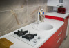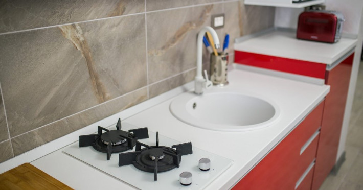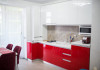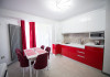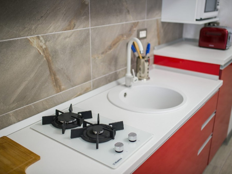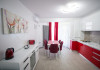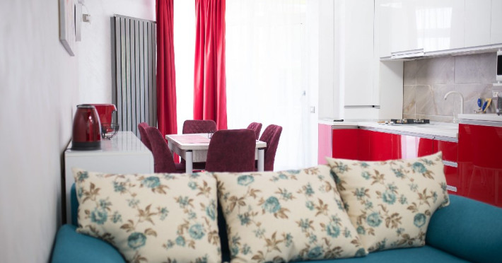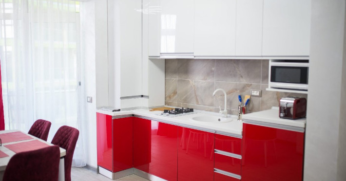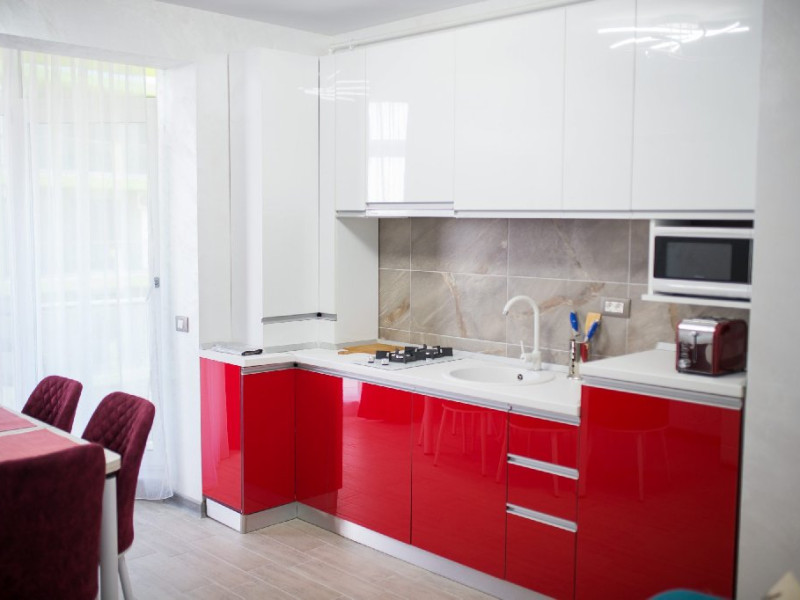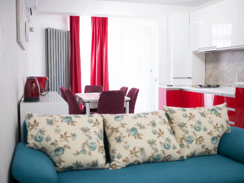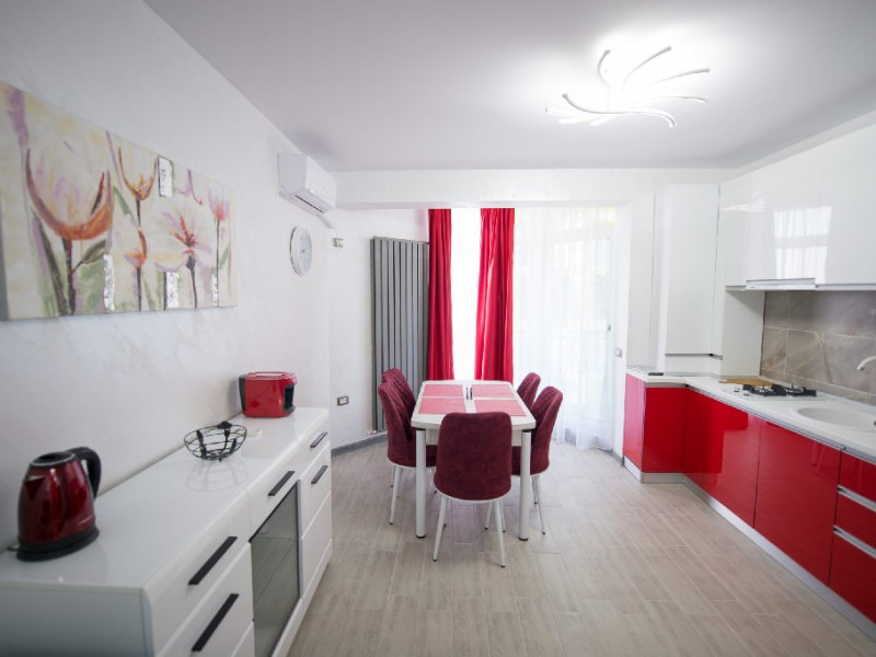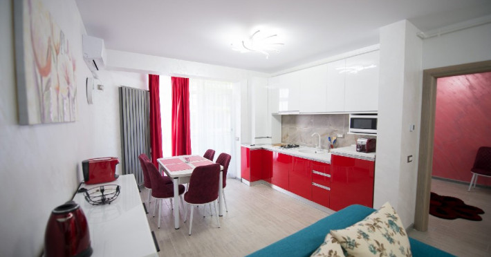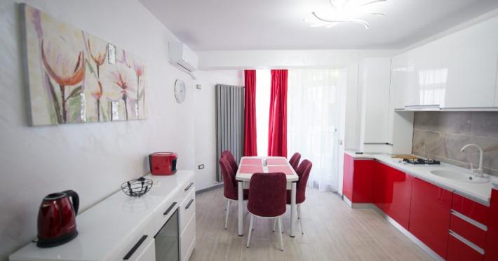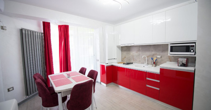 Bucataria este un exemplu de functionalitate si stil. Mobilierul in tonuri de rosu si alb adauga un strop de dinamism si prospetime spatiului. Aceasta este dotata cu toate utilitatile necesare: aragaz, cuptor cu microunde, frigider si chiuveta spatioasa. Zona de dining este subliniata de o masa alba eleganta, inconjurata de scaune rosii de catifea, ce completeaza paleta cromatica a incaperii. Draperiile rosii adauga un plus de personalitate si intimitate spatiului.