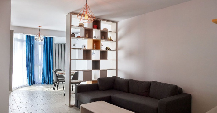 Apartamentul Mamaia din complexul Alezzi ofera o sufragerie open space, luminata si aerisita, care invita la relaxare. Punctul central este canapeaua extensibila de culoare gri, completata de perne colorate ce adauga o pata de culoare si dinamism incaperii. In fata canapelei, un televizor modern este plasat pe o mobila alba, oferind un contrast placut. Draperiile gri completeaza designul, asigurand intimitate si rafinament.