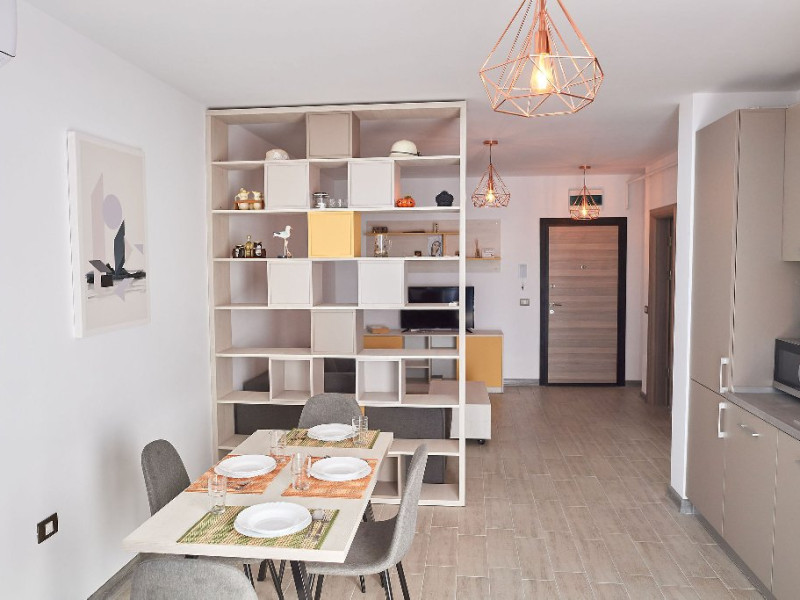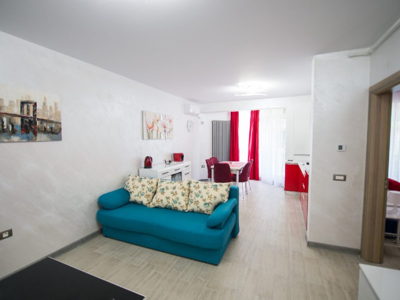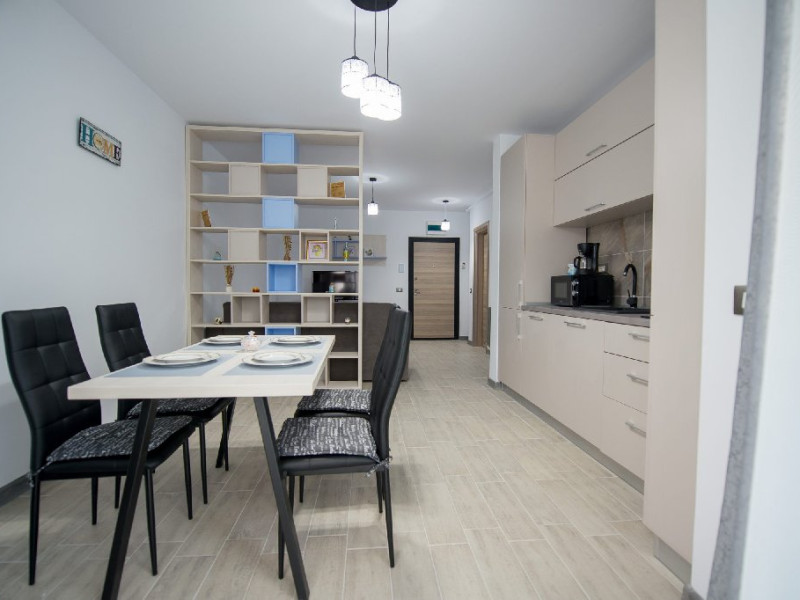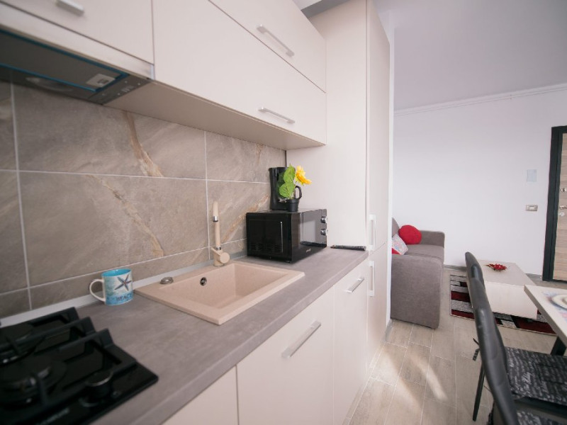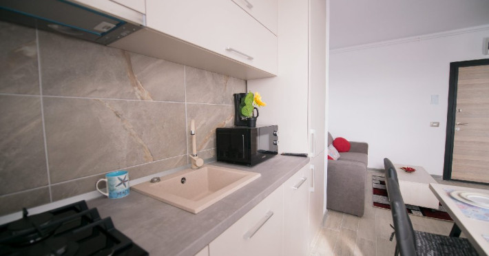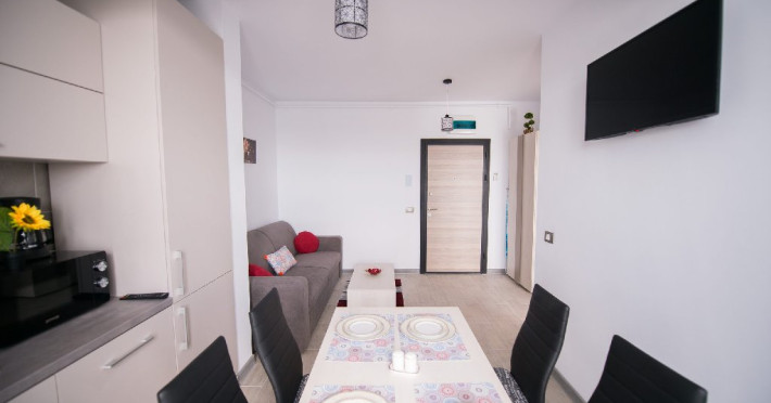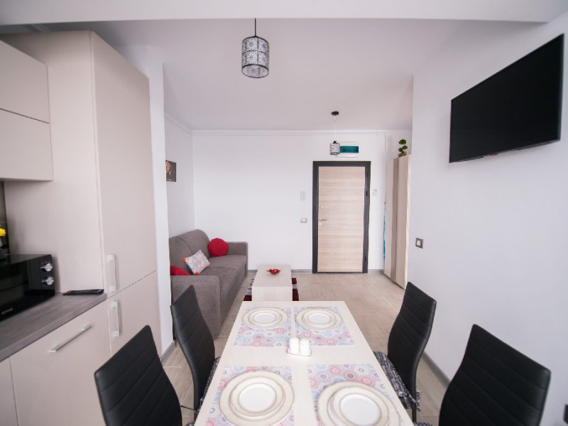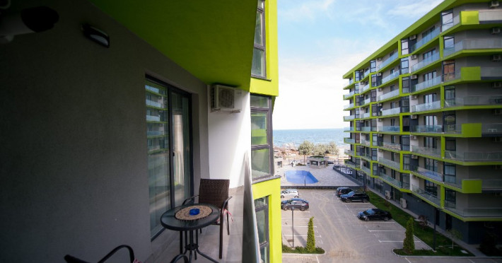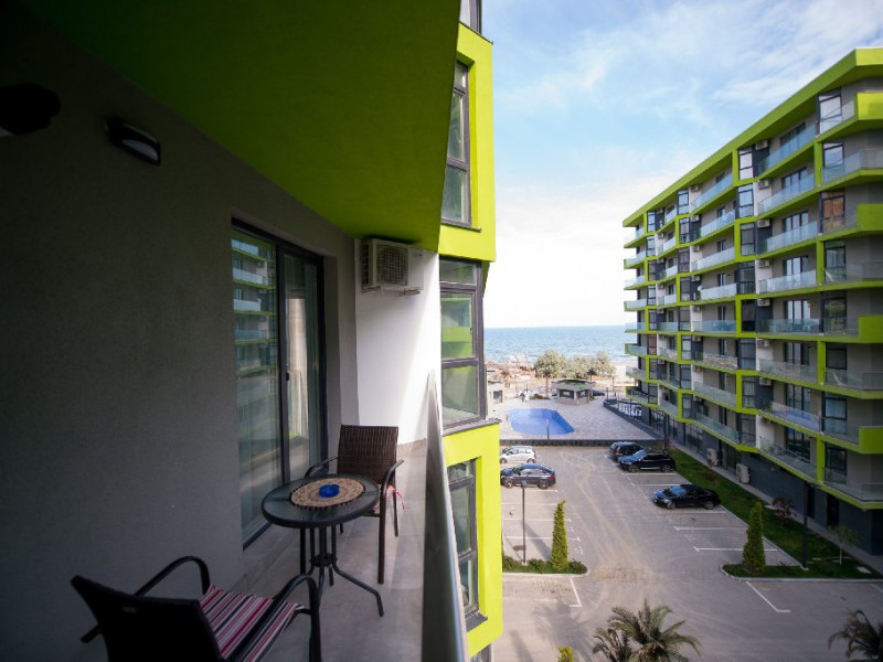 Apartamentul este situat intr-o cladire noua, beneficiind de un design rafinat si un balcon generos, unde oaspetii se pot bucura de momente de relaxare si de briza marii.