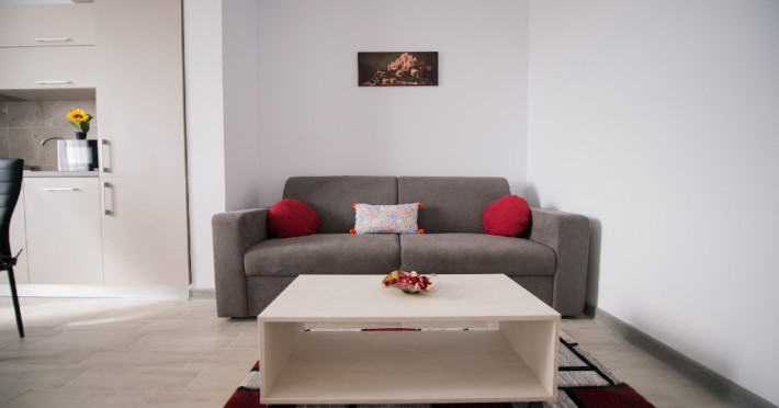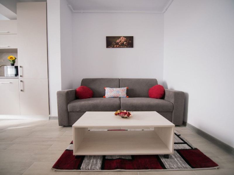 Apartamentul din Aparthotel, situat in complexul Alezzi, ofera o sufragerie open space care emana rafinament si spatialitate. Canapeaua extensibila de culoare inchisa, mare si invitanta, domina aceasta zona, fiind perfecta pentru relaxare sau vizionarea unui film. In fata acesteia, pe un mobilier alb elegant, se afla un televizor modern, care completeaza functionalitatea spatiului. Nuantele deschise ale peretilor si ale mobilierului aduc un plus de luminozitate si aerisire, creand o atmosfera calda si primitorie.