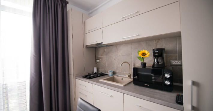 Bucataria este complet mobilata si echipata cu electrocasnice moderne, inclusiv aragaz, cuptor, hota, aparat de cafea, fierbator, prajitor de paine si ustensile de bucatarie, fiind ideala pentru sejururi de mai multe zile.