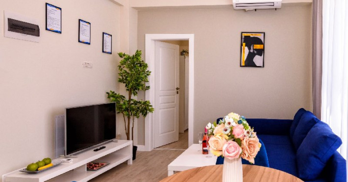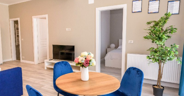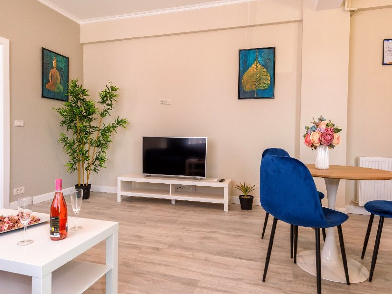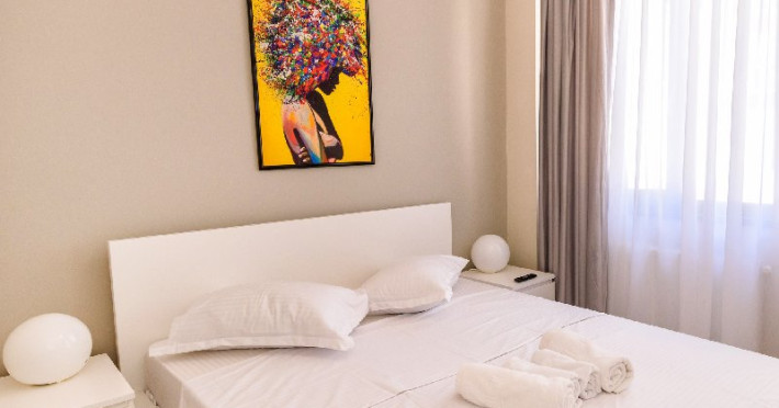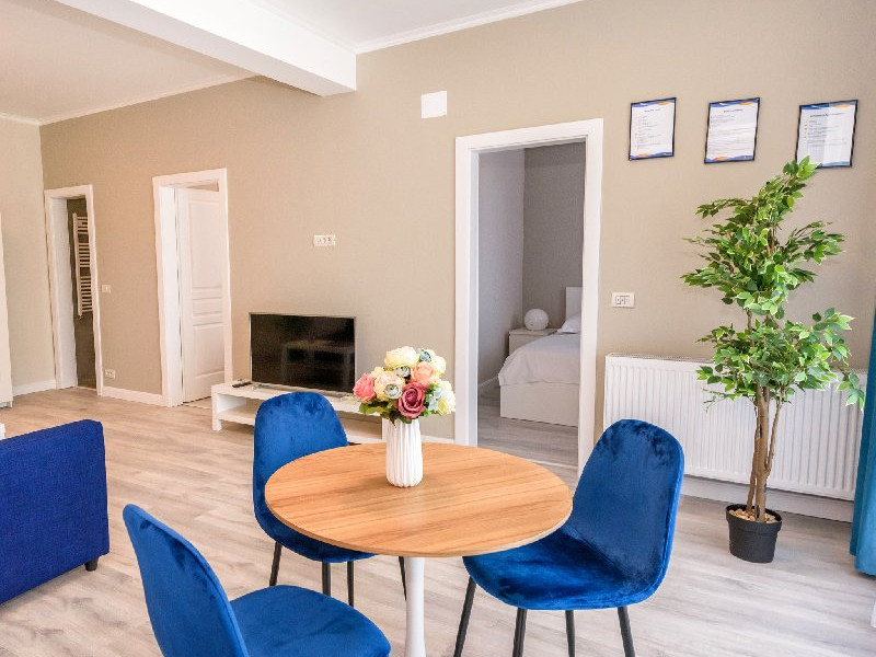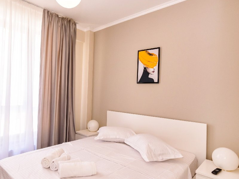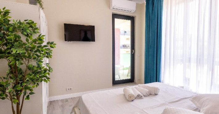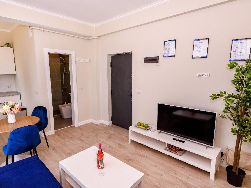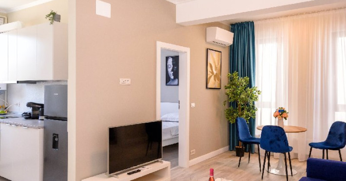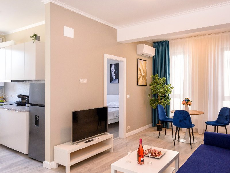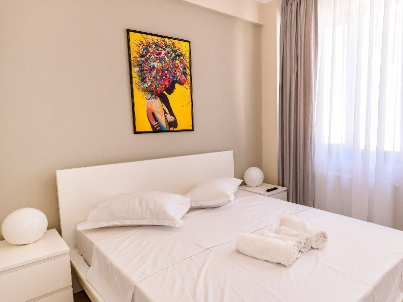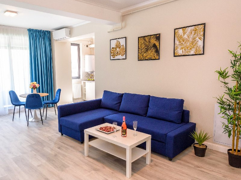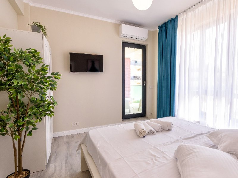 Ap cu un dormitor nr. 401 Capacitate maxima : 4 persoane Suprafata : 35 mp Etaj : Parter Terasa : Nu are Structura ap : Living : Canapea extensibila 2 persoane (160 x 200 cm) , aer conditionat , dulap haine , masa si scaune pt servit mancarea , TV smart 108 cm diagonala , masa de calcat , fier de calcat , uscator de rufe Bucatarie : plita , hota , frigider , espressor , sandwich maker , prajitor de paine , fierbator de apa , masina de spalat rufe Baie : dus , wc , lavoar , oglinda baie , Dormitor : Pat matrimonial (160 x 200 cm) , TV LED diagonala 81 cm , dulap pt haine , uscator de par