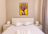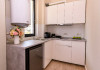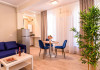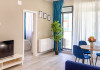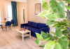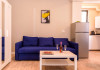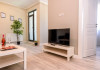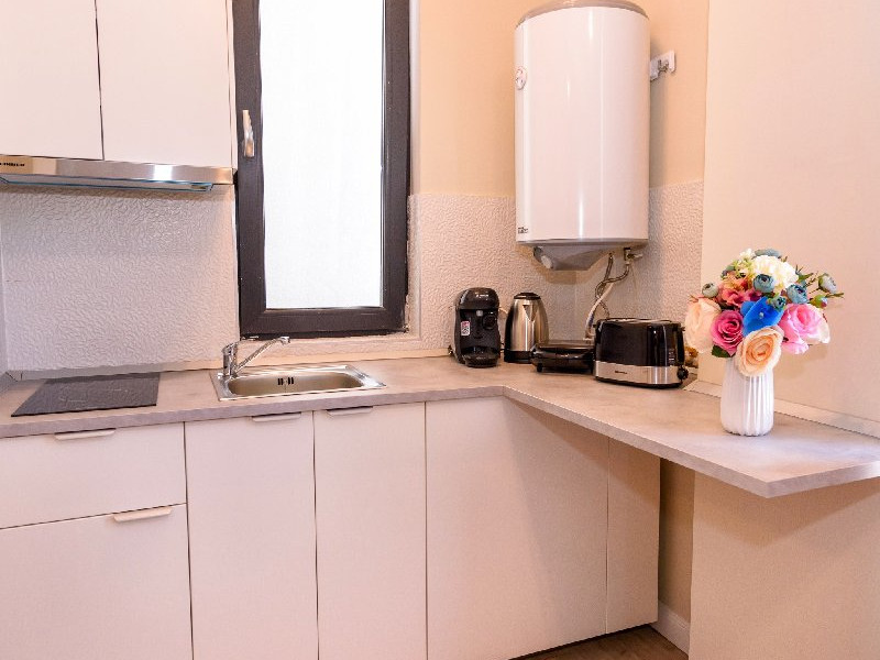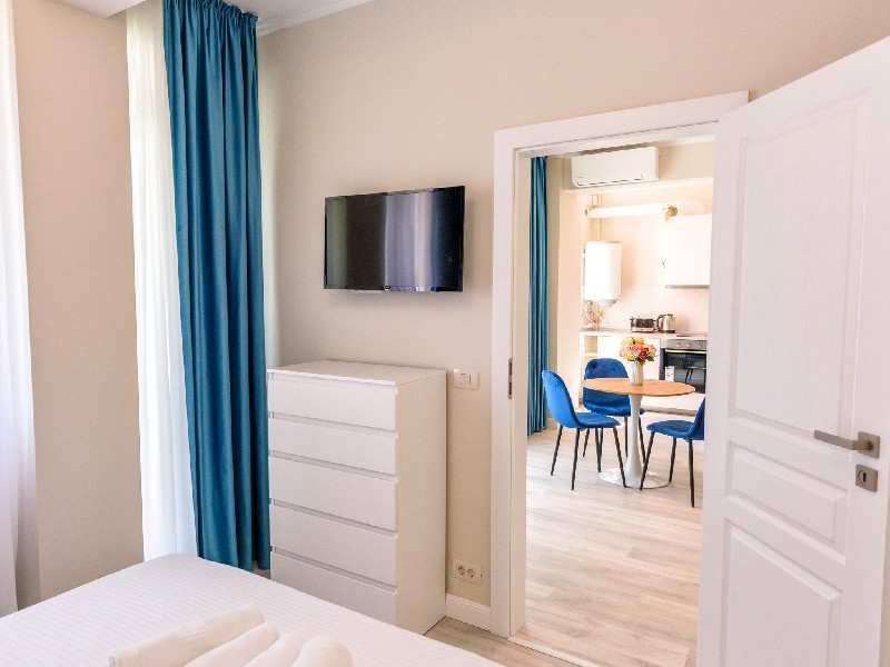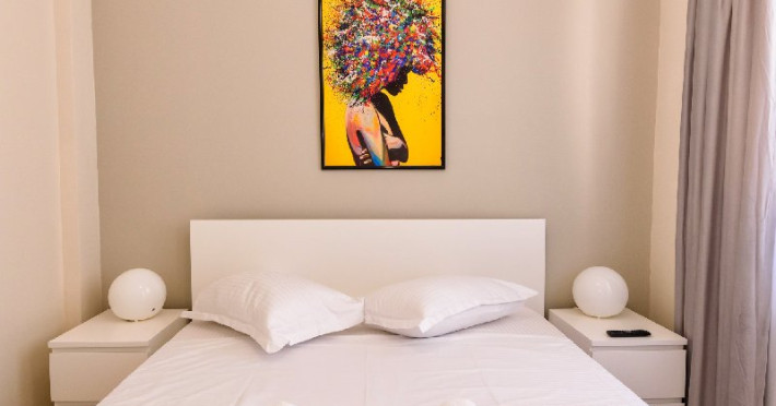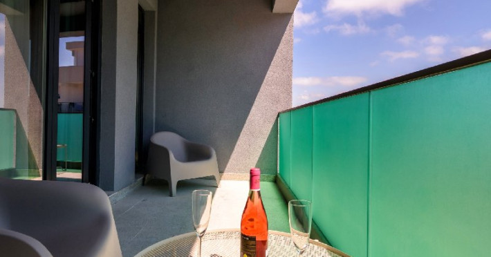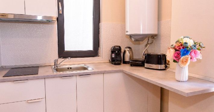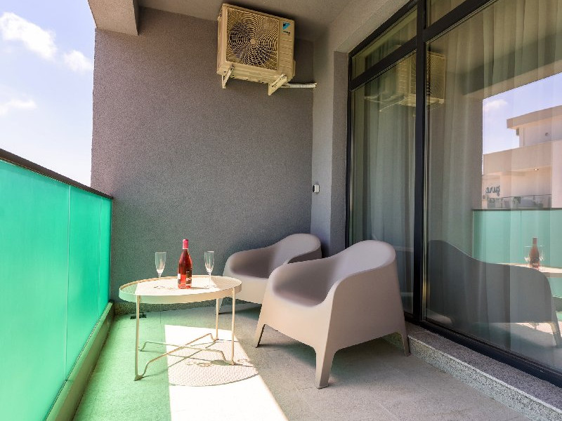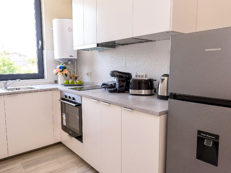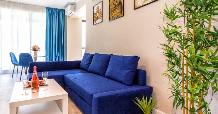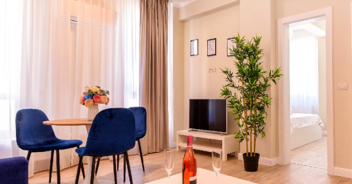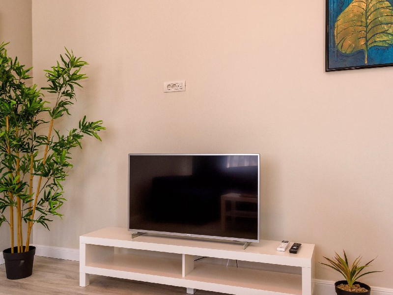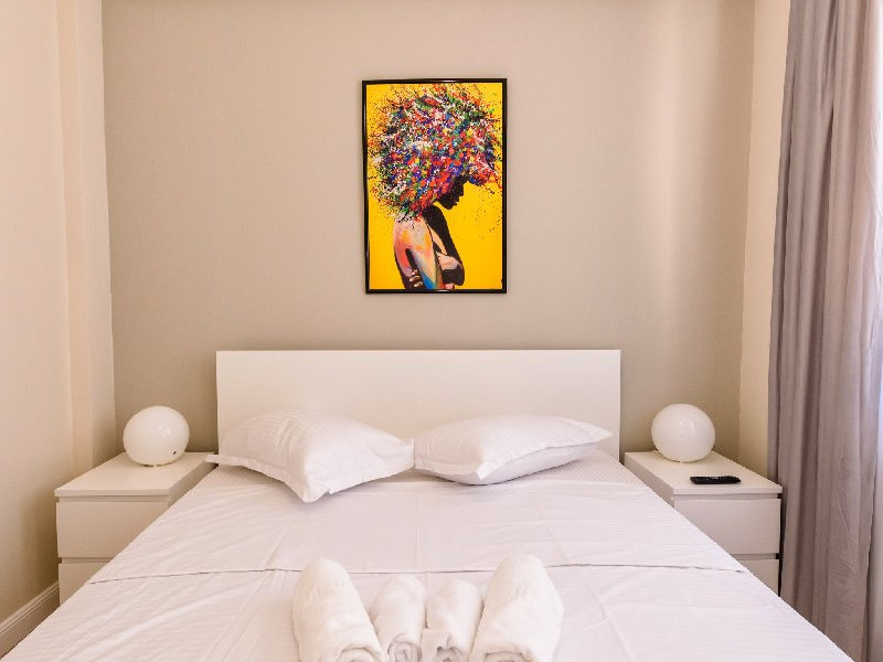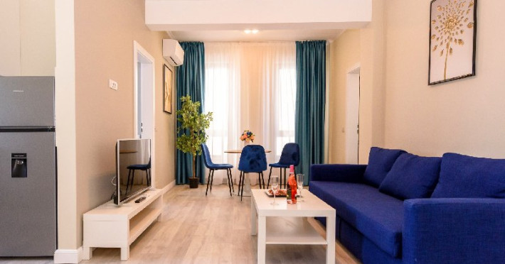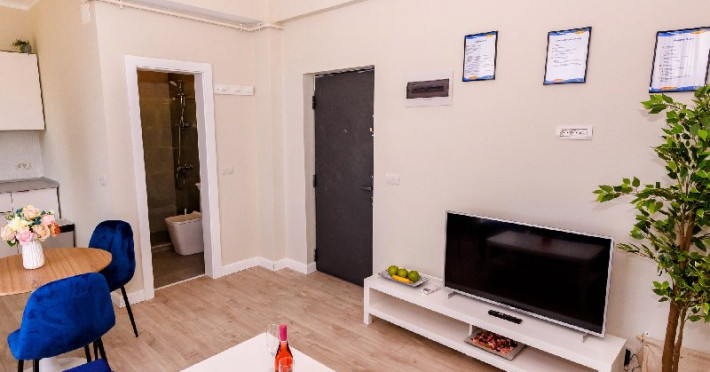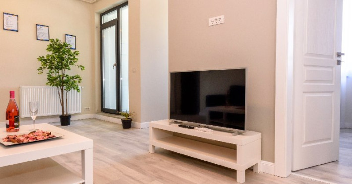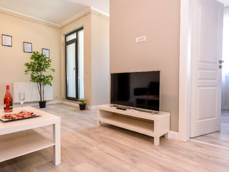 Ap cu un dormitor nr. 401 Capacitate maxima : 4 persoane Suprafata : 35 mp Etaj : Parter Terasa : Nu are Structura ap : Living : Canapea extensibila 2 persoane (160 x 200 cm) , aer conditionat , dulap haine , masa si scaune pt servit mancarea , TV smart 108 cm diagonala , masa de calcat , fier de calcat , uscator de rufe Bucatarie : plita , hota , frigider , espressor , sandwich maker , prajitor de paine , fierbator de apa , masina de spalat rufe Baie : dus , wc , lavoar , oglinda baie , Dormitor : Pat matrimonial (160 x 200 cm) , TV LED diagonala 81 cm , dulap pt haine , uscator de par