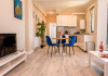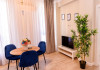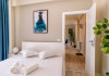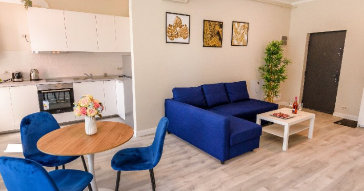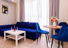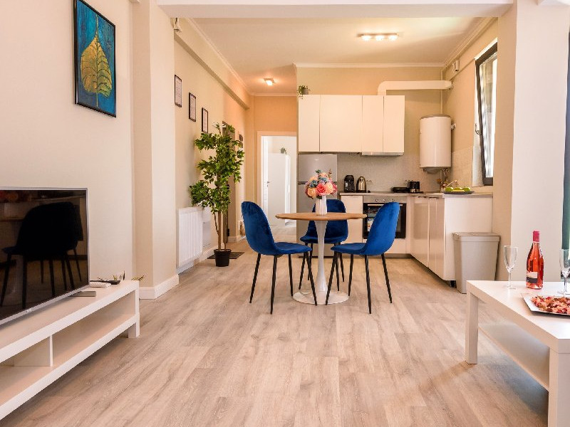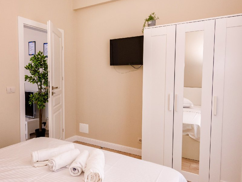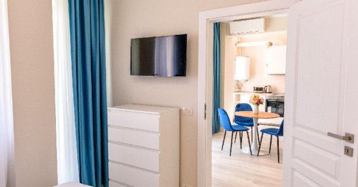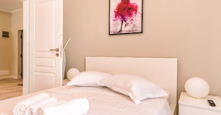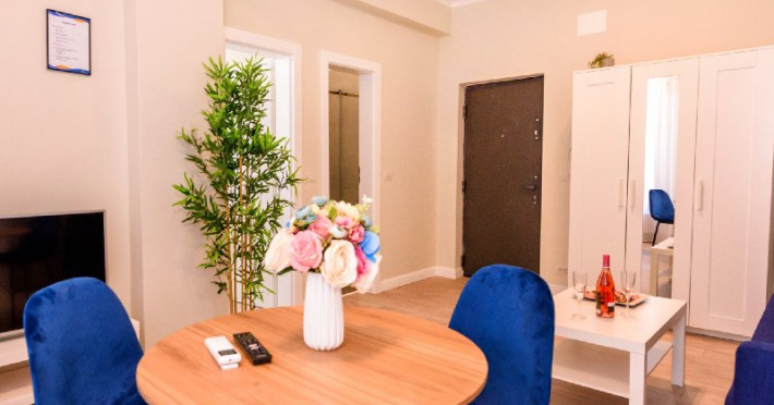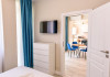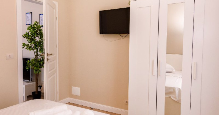 Ap cu un dormitor nr. 404 Capacitate maxima : 4 persoane Suprafata : 38 mp Etaj : Parter Terasa : Nu are Structura ap : Living : Canapea extensibila 2 persoane (160 x 200 cm) , aer conditionat , dulap haine , masa si scaune pt servit mancarea , TV smart 108 cm diagonala , masa de calcat , fier de calcat , uscator de rufe Bucatarie : plita , cuptor , hota , frigider , masina de spalat , espressor , sandwich maker , prajitor de paine , fierbator de apa Baie : dus , wc , lavoar , oglinda baie , Dormitor : Pat matrimonial (160 x 200 cm) , TV LED diagonala 81 cm , uscator de par Dressing : mobilier depozitare haine , masina de spalat rufe