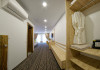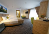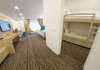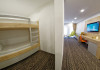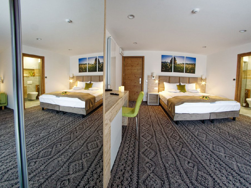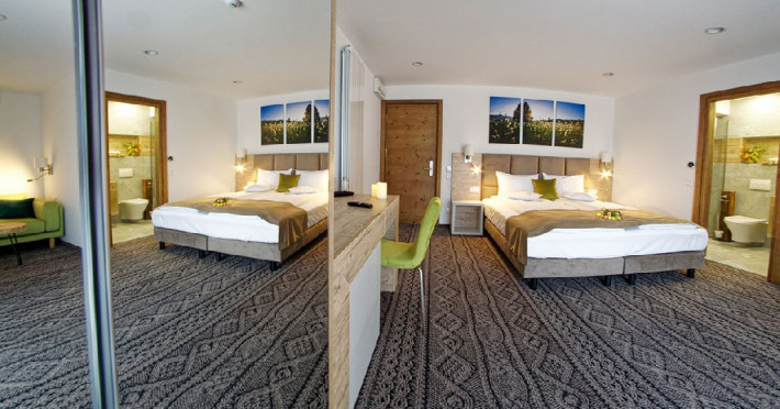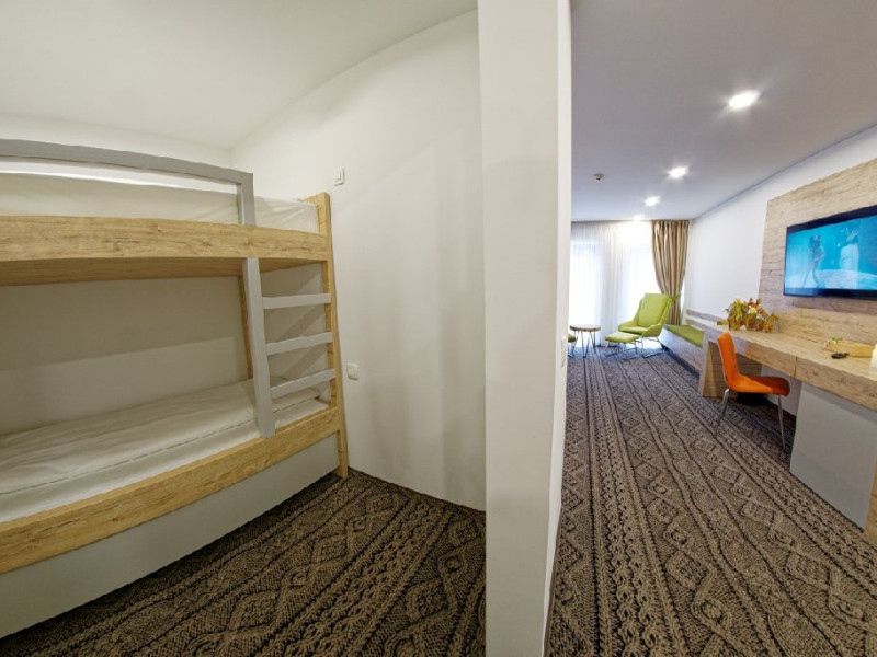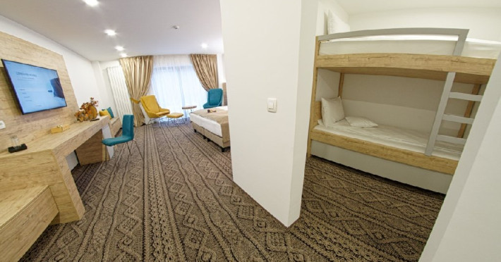 Camera family Deluxe - camerele deluxe family se afla la primul nivel al hotelului. Acestea au o suprafata de 41.5 mp., avand pat dublu matrimonial, paturi suprapuse pentru copii si baie cu dus. Camerele deluxe family pot fi cu doua paturi separate.