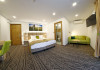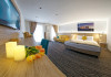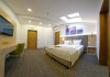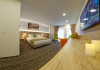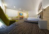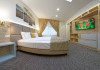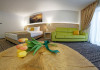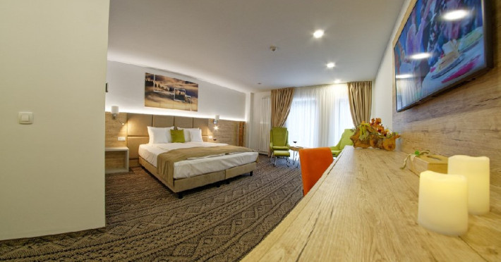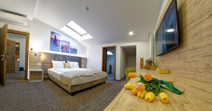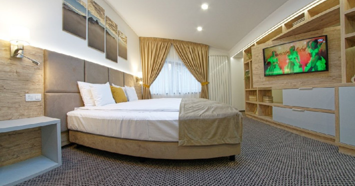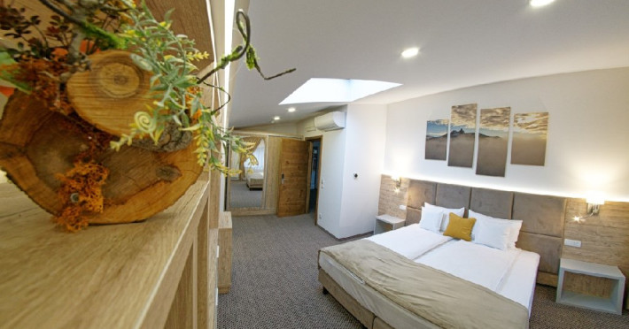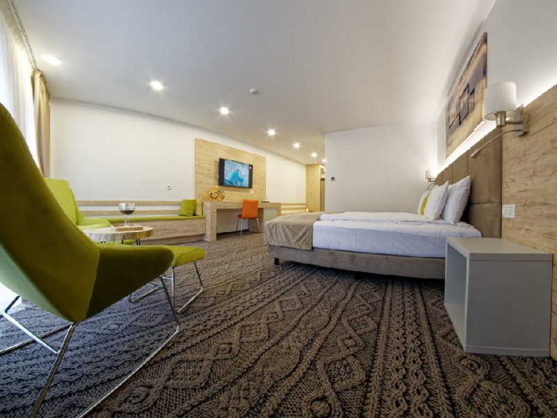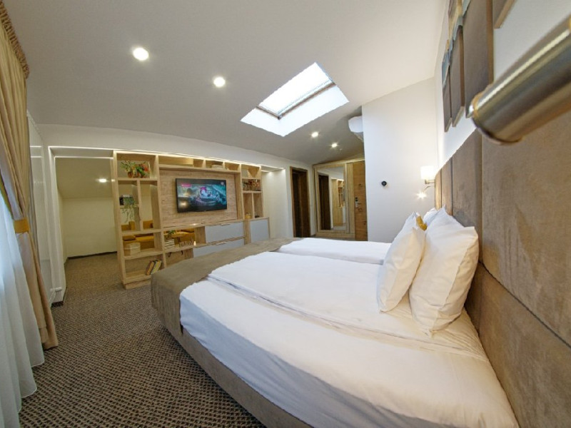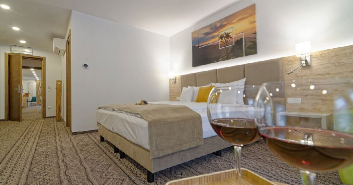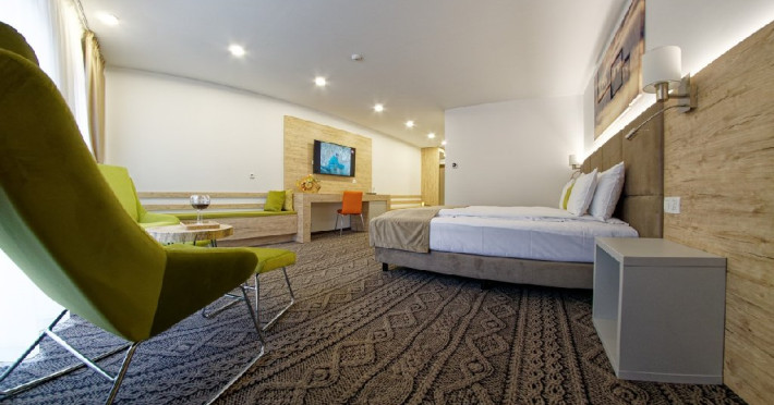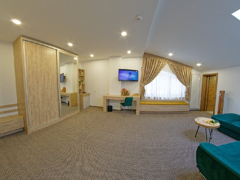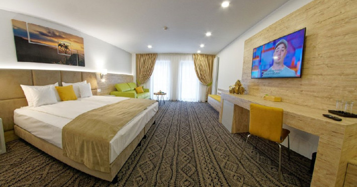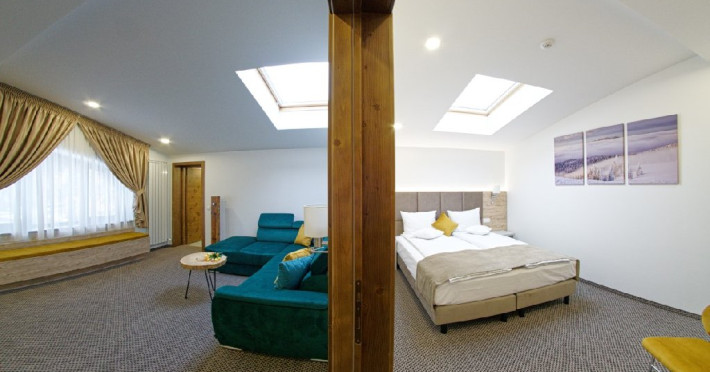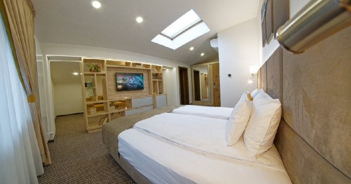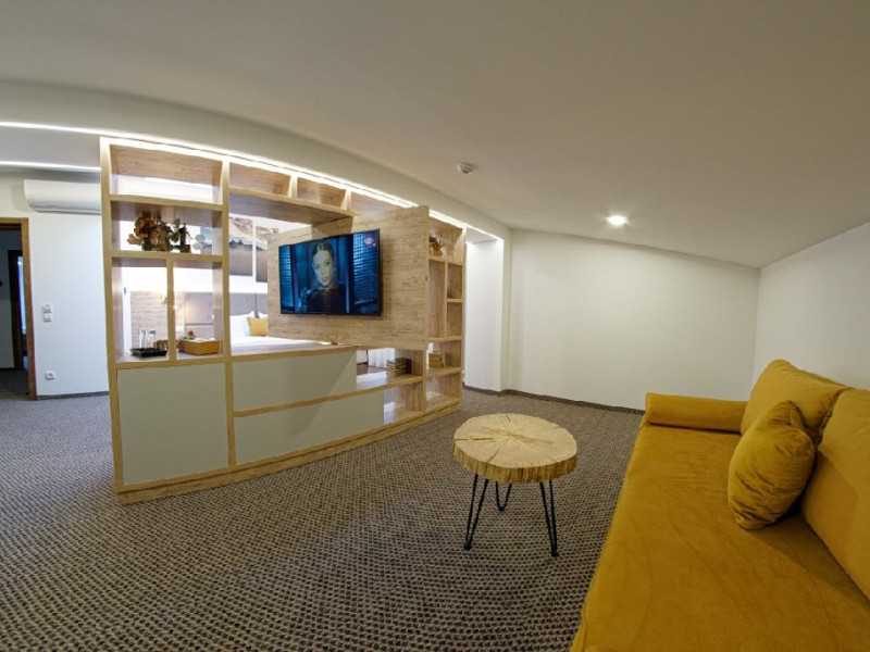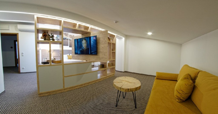 Junior Suite - suprafata generoasa, de 32 mp, compus dintr-o camera de zi spatioasa, dotata cu frigider, smartTV, canapea extensibila si o zona de dormit intima, cu pat matrimonial XL, separata de zona de zi printr-o piesa de mobilier multifunctionala, cu smartTV montat pe o placa rotativa 180 grade.