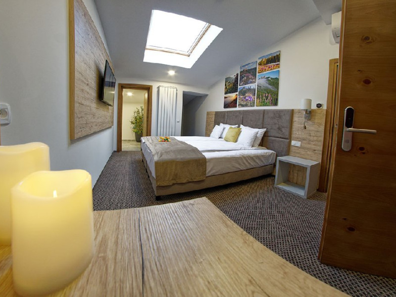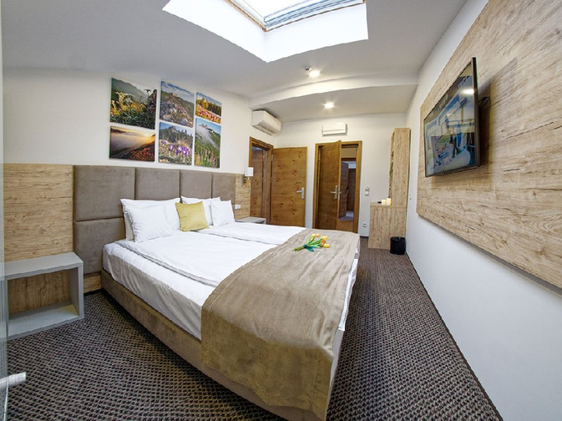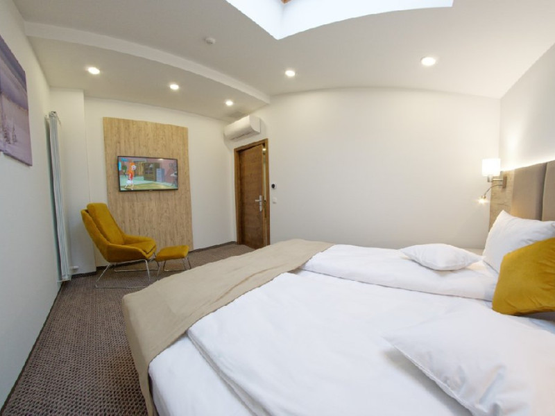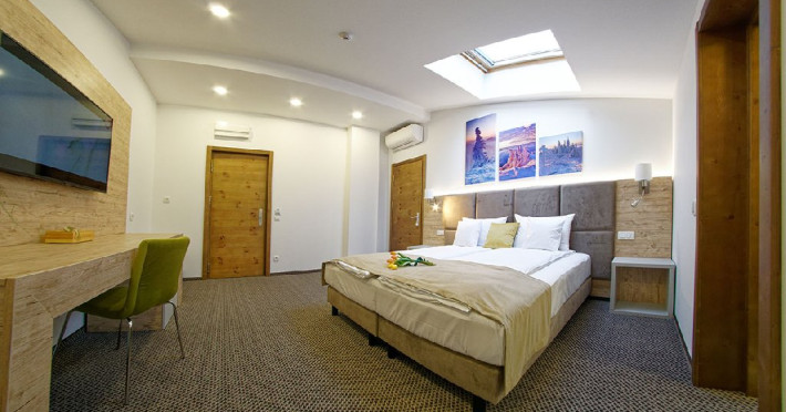 Camera dubla Simpla - camera spatioasa cu suprafata intre 16 si 23 mp., dotat cu minibar, smartTV, cu pat matrimonial XL, cu geamuri velux.
