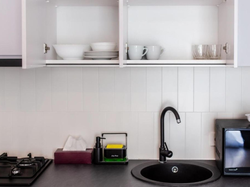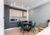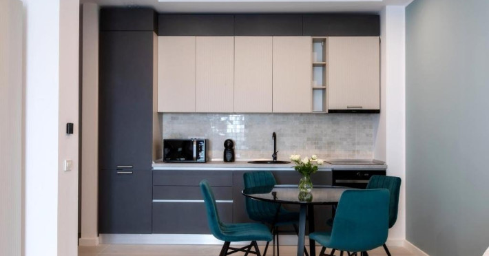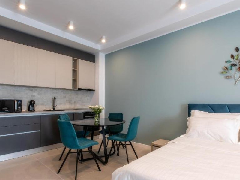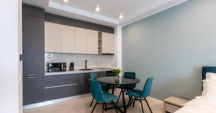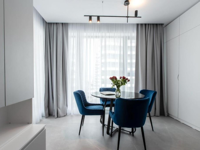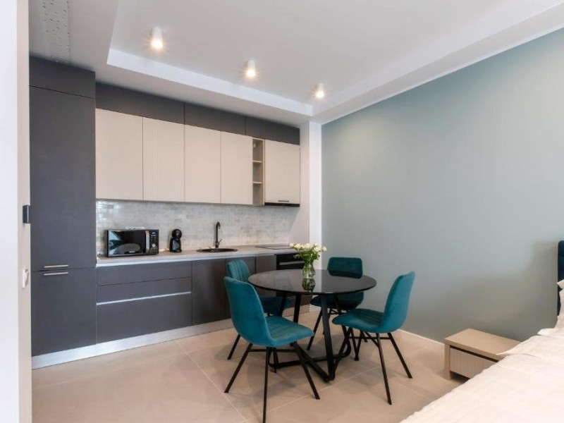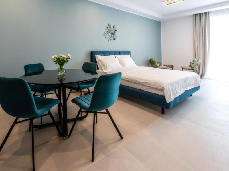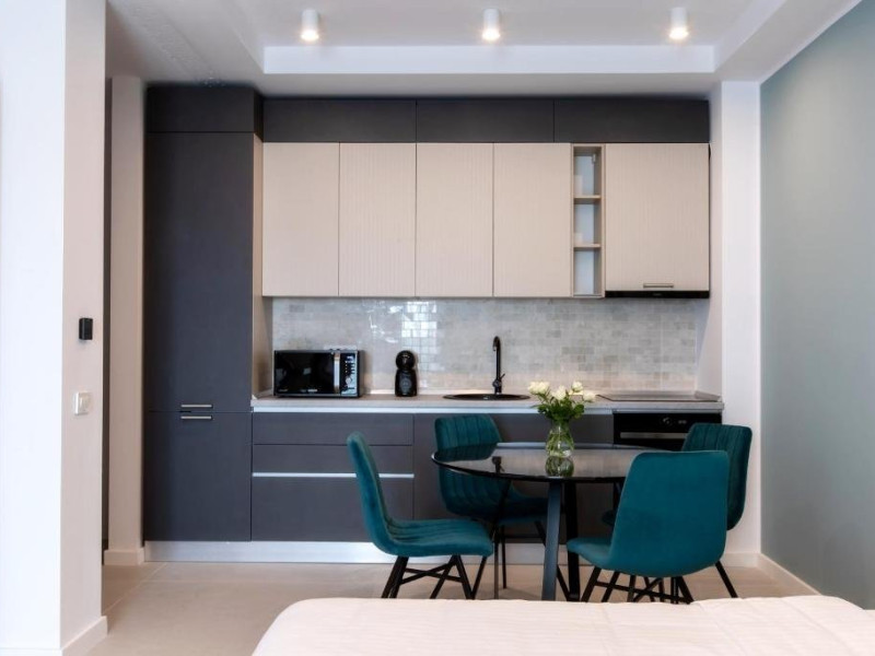 Bucataria complet utilata este un alt punct forte al studioului: include frigider, plita, hota, cuptor cu microunde, aparat de cafea, prajitor de paine si vesela completa. Tot ce ai nevoie pentru a prepara mese gustoase chiar la malul marii. Alaturi, zona de dining este amenajata cu masa si scaune, perfecta pentru mic dejunuri sau cine servite intr-un cadru confortabil.