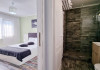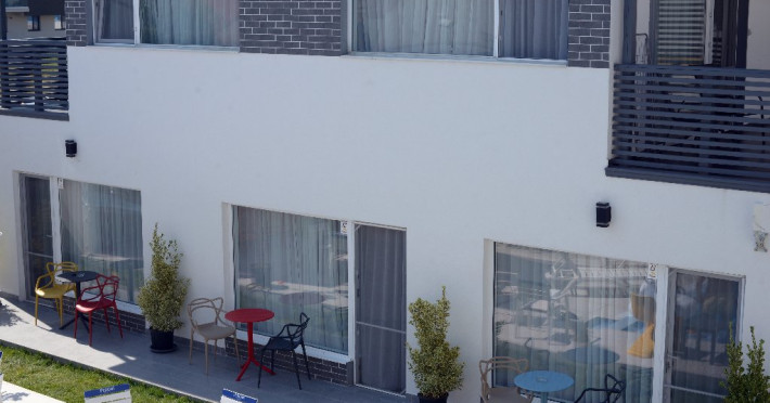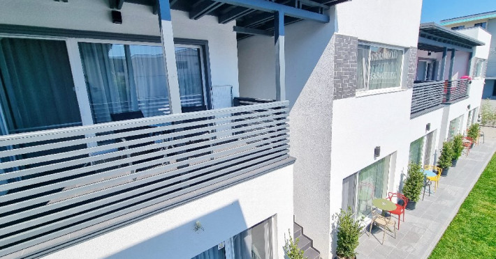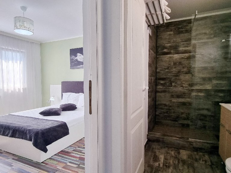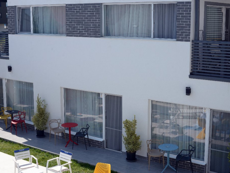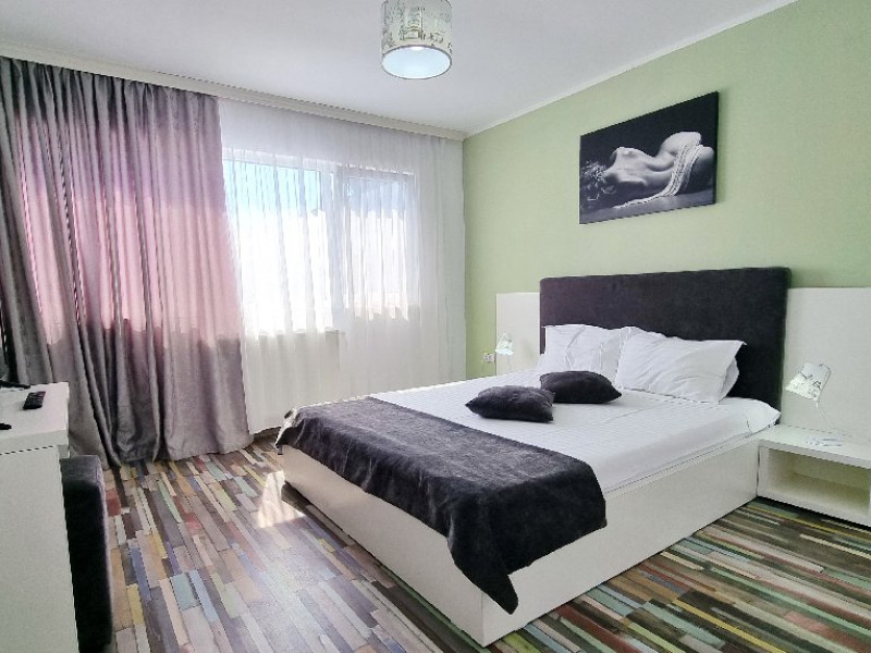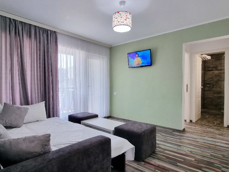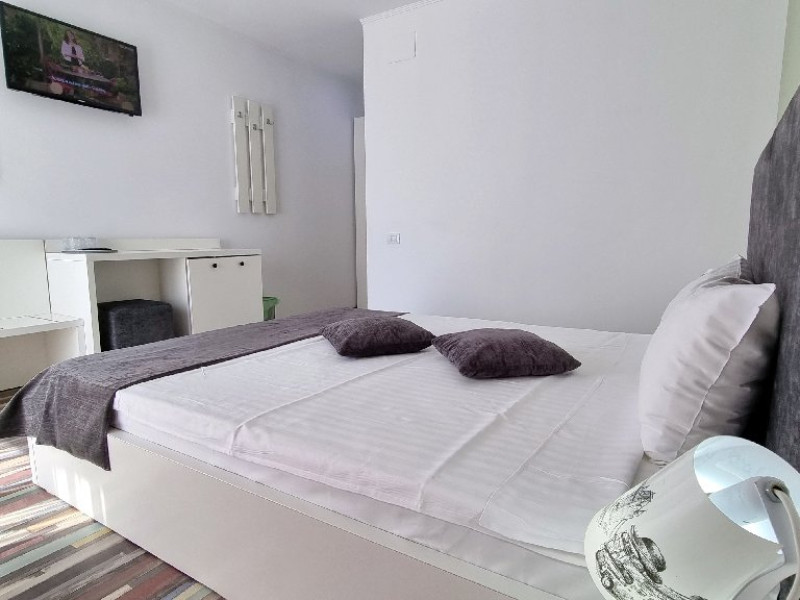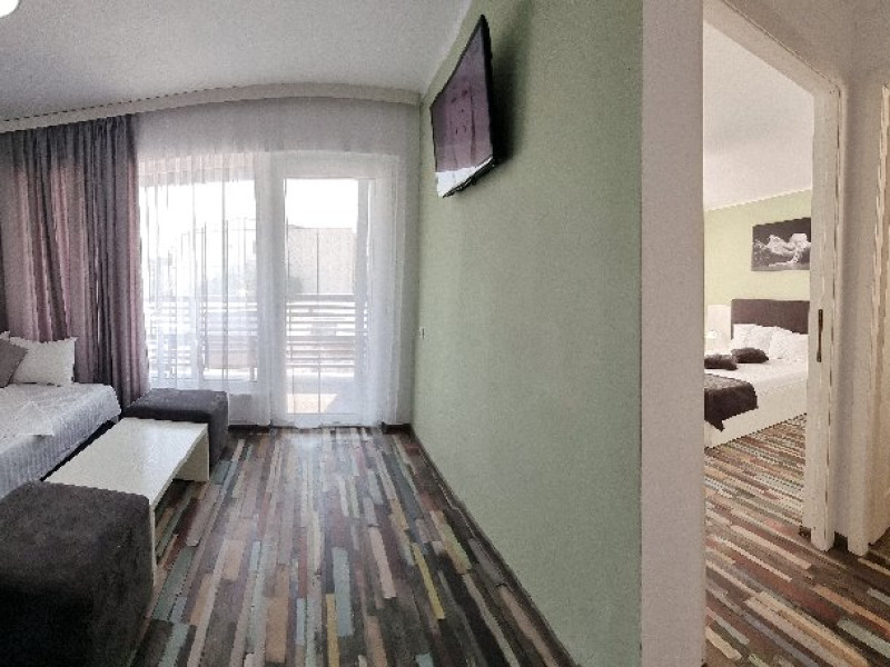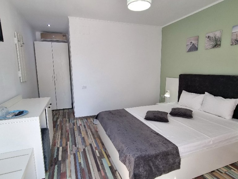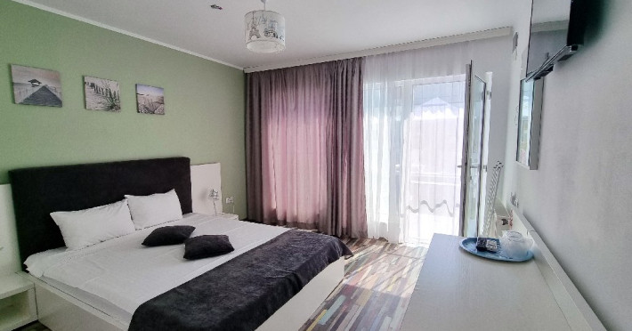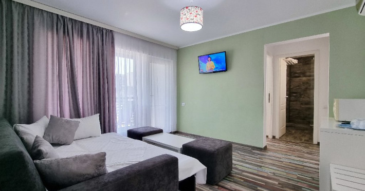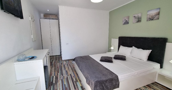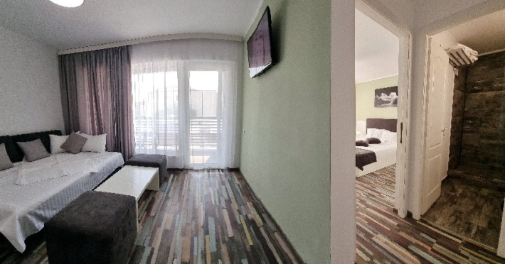 Camerele sunt dotate cu pat matrimonial (160x200 cm), si au baie proprie. Toate camerele - au acces direct din curtea interioara. Camerele de la parter au terasa proprie cu masuta si scaune. De asemenea, camerele de la etaj au balcon dotat cu masuta si scaune. Apartamentul este compus din dormitor, living, hol, baie, terasa. Toate apartamentele sunt situate la etaj si au balcon. Pat matrimonial 160x200 cm in dormitor si canapea extensibila in living (extinsa e ca un pat normal de 160x200), cuptor cu microunde.