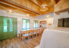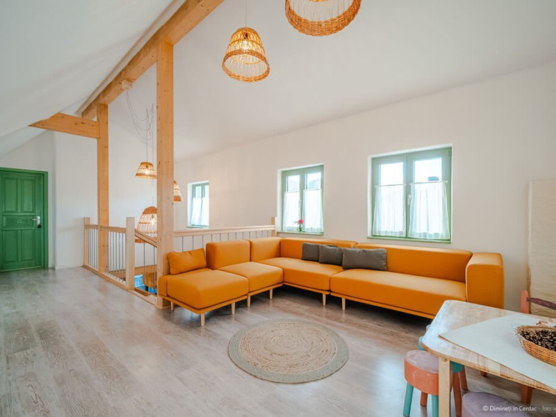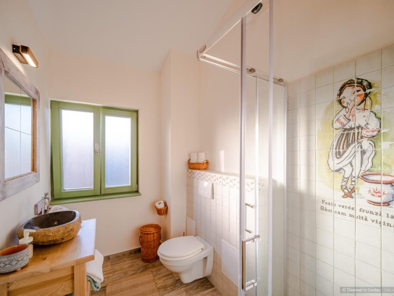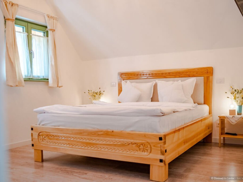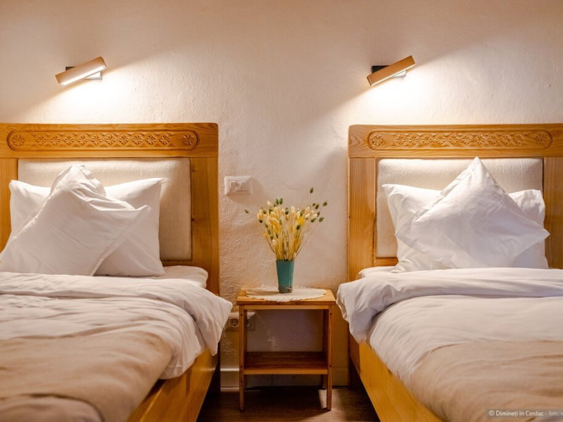 DESCRIERE CAMERE Se propun spre inchiriere o vila cu 4 camere si 4 bai dar care datorita structurii casei permite 4 scheme de rezervare. Fiecare din aceste posibilitati asigura intimitatea turistilor si acces separat in corpul de cladire pe care il rezerva. Se pot inchiria in paralel spatii Casa Mare si Camera garsoniera - Camera cu Arici. 1. Casa Dimineti in Cerdac - 1 buc. Inchiriere intreaga unitate - 4 camere, 4 bai, 2 livinguri spatioase Acces la soba traditionala cu pat incalzit, parcare interioara 6 locuri, gradina 5500 mp, foisor, loc gratar Acces exclusiv la gradina si pe cerdac Capacitate optima - 10 persoane (8 adulti si 2 copii). Posibilitate de suplimentare capacitate de cazare cu inca 4 locuri. Primiti din partea casei: 1 foc in soba pe seara in sezonul rece, sfaturi si recomandari despre obiective, evenimente si furnizori locali. 2. Camera cu Arici - 1 buc Camera cu Arici este un spatiu tip studio, dotat cu bucatarie complet utilata, baie si intrare separata din cerdac. Acces la gradina 5500 mp, parcare interioara, cerdac, foisor, loc de gratar. Capacitate optima - 2 persoane. Posibilitate de suplimentare capacitate de cazare cu inca 1 loc. Acces la gradina si pe cerdac. 3. Casa Mare - 1 buc Corp central al casei compus din 3 camere (dintre care 2 triple), 3 bai, 2 livinguri spatioase, acces la soba traditionala cu pat incalzit Capacitate optima - 8 persoane (6 adulti si 2 copii). Posibilitate de suplimentare capacitate de cazare cu inca 4 locuri. Acces la gradina 5500 mp, parcare interioara 6 locuri, foisor, loc de gratar. 4. Casa Mare - 2 camere triple - 1 buc Inchiriere doar cele 2 camere triple, 3 bai, 2 livinguri spatioase, acces la soba traditionala cu pat incalzit. Capacitate optima - 6 persoane (4 adulti si 2 copii). Posibilitate de suplimentare capacitate de cazare cu inca 2 locuri. Acces la gradina 5500 mp, foisor, parcare interioara si pe cerdac.