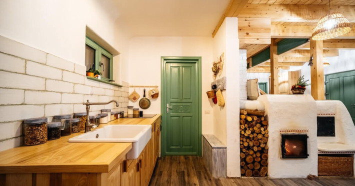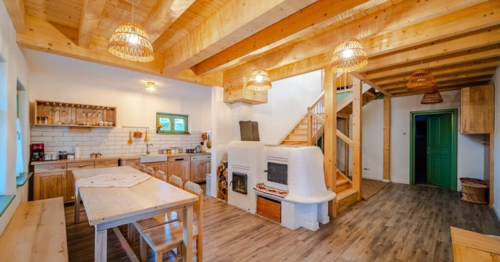 FACILITATI UNITATE 2 livinguri generoase Terasa acoperita tip cerdac Bucatarie complet dotata si utilata, cafea, ceai si condimente de baza Gradina terasata cu loc pentru foc de tabara sau ceaun 6 locuri de parcare in incinta Loc de joaca pentru copii cu casuta din copac Soba traditionala cu loc de dormit in livingul principal Loc de joaca copii in livingul de la mansarda Incalzire prin pardoseala si apa calda asigurata prin pompe de caldura Sistem de monitorizare video
