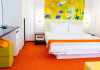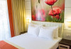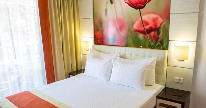 DESCRIERE CAMERE Numar total camere: 448 Duble: 371 Mera Sky- 206 camere duble standard, dispuse pe 12 niveluri; Mera Blue- 122 camere duble standard; Mera Villas- 41 camere duble standard, 47 camere duble King. Apartamente: 63 - apartamente cu doua dormitoare, situate in Mera Villas; Apartamente junior: 38 : Mera Blue- 18 junior suite; Mera Villas- 25 Junior Suite; Ansamblul de vile dispune de 2 piscine proprii cu minicascada si jacuzzi, cu o adancime de 150 cm. Oaspetii Mera Villas au la dispozitie, in proximitatea piscinelor, 2 baruri All Inclusive si un restaurant, destinate exclusiv acestora. Dotari camere: sistem de acces in camera pe baza de cartela,aer conditionat, TV LCD, telefon, seif, prosoape pentru plaja, baie cu cabina de dus, uscator de par, cosmetice hoteliere, balcon cu mobilier de terasa,uscator de rufe, minibar contra cost. Fiecare dintre camerele decorate in tonuri chic-estivale ofera un pat dublu king si sunt dotate cu sistem de acces pe baza de cartela. Camera dubla matrimoniala/twin cu suprafata de de 15.20 mp are un pat matrimonial (180/190 cm) sau doua paturi individuale ( 80/190 cm). Recomandare: Camera Dubla poate gazdui 2 adulti si 1 copil. In acest tip de camera se poate adauga un pat suplimentar pliant, care va reduce semnificativ spatiul din camera, conform imaginilor prezentate mai jos: Apartamentul Junior Suite este compus dintr-o camera de zi, cu canapea extensibila, si un dormitor cu pat matrimonial, avand o suprafata de28,44 mp. Fiecare camera dispune de baie proprie si balcon. Acest tip de camera nu suporta adaugarea unui pat suplimentar. Recomandare: Junior Suite este destinat cazarii a 2 adultisi 2 copii sau a 3 adulti.