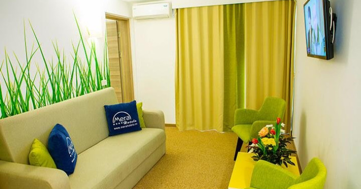 Mera Villas Mera Villas este un ansamblu exclusivist, compus din 49 devile moderne, gata sa satisfaca si cei mai pretentiosi oaspeti. Acest complex cu accente mediteraneene isi asteapta oaspetii in cele 41 camere duble, 47 de camere duble King, 25 Junior Suite si 63 de apartamente cu 2 dormitoare. Mera Villas ofera o experienta selecta, unica, departe de zgomotul si aglomeratia cotidiana, o oaza de liniste si relaxare, unde oaspetii isi doresc mereu sa revina. Ansamblul de vile dispune de 2 piscine proprii cu minicascada si jacuzzi, cu o adancime de 150 cm. Oaspetii Mera Villas au la dispozitie, in proximitatea piscinelor, 2 baruri All Inclusive si un restaurant, destinate exclusiv acestora. Descriere camere Vile Camera dubla matrimoniala are o suprafata de de 15,20 mp, pat matrimonial (160/190 cm). Recomandare: Camera dubla poate gazdui 2 adulti si 1 copil. Acest tip de camera nu suporta adaugarea unui patsuplimentar. Camera dubla King este prevazuta cu pat matrimonial si canapea extensibila (120cm/200cm), cu o suprafata de 20 mp. Acest tip de camera nu suporta adaugarea unui pat suplimentar. Recomandare: Camera dubla King este destinata cazarii a 2adulti si 2 copii, sau 3 adulti. Apartamentul Junior Suite este compus dintr-o camera de zi,cu canapea extensibila (160cm/200cm) si dormitor cu pat matrimonial. Fiecare camera dispune de baie proprie si balcon. Acest tip de camera nu suporta adaugarea unui pat suplimentar. Recomandare: Junior Suite este destinat cazarii a 2 adulti si 2 copii sau 3 adulti, avand o suprafata de 28,25mp. Apartamentul dublu dormitor este un ansamblu compus din 2 dormitoare decomandate, fiecare cu pat matrimonial si baie proprie. Acest tip de camera nu suporta adaugarea unui pat suplimentar. Recomandare: Apartamentul poate gazdui pana la 4 adulti,avand o suprafata de 30 mp. Apartamentul cu 2 camere comunicante este un ansamblu compus din 2 dormitoare comunicante (nedecomandate), fiecare cu pat matrimonial, baie proprie si terasa. Recomandare: Apartamentul poate gazdui pana la 4 adulti, avand o suprafata de 30 mp. Acest tip de camera nu suporta adaugarea unui pat suplimentar. Apartamentul cu 3 camere este un ansamblu compus din 2 dormitoare cu pat matrimonial si baie proprie si un living cu o canapea extensibila. Recomandare: Apartamentul poate gazdui pana la 5 adulti, avand o suprafata de 48,25 mp. Acest tip de camera nu suporta adaugarea unui pat suplimentar.