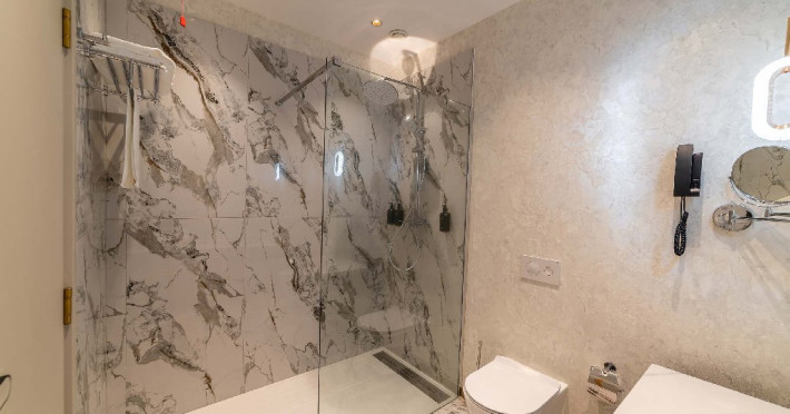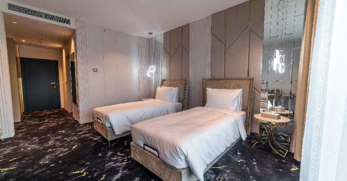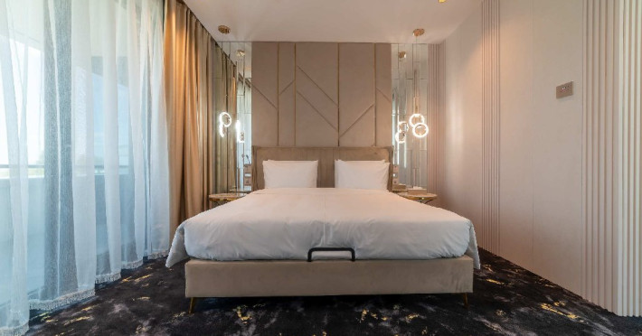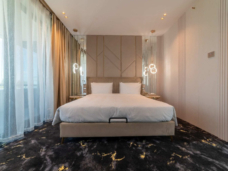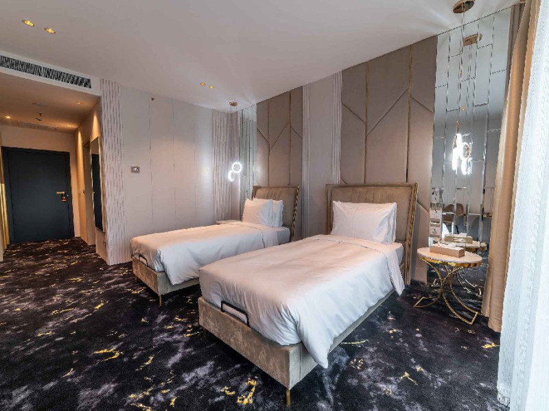 DESCRIERE CAMERE Hotelul de 5 Stele pune la dispozitia oaspetilor 53 de camere. Fiecare camera a hotelului nostru este conceputa pentru a oferi oaspetilor confortul si relaxarea de care au nevoie, intr-un ambient modern si primitor. Tipuri de Camere: - 31 camere Standard Double - cu terasa proprie - 10 camere Premium - spatii extinse cu facilitati superioare - 10 camere Twin - perfecte pentru calatorii de afaceri - 2 camere Single - ideale pentru sejururi individuale Facilitati camere: terasa cu priveliste, produse cosmetice premium marca Chopard, aer conditionat, draperii blackout, seif de dimensiuni laptop, birou de lucru, apa/ cafea/ ceai, minibar, WiFi.