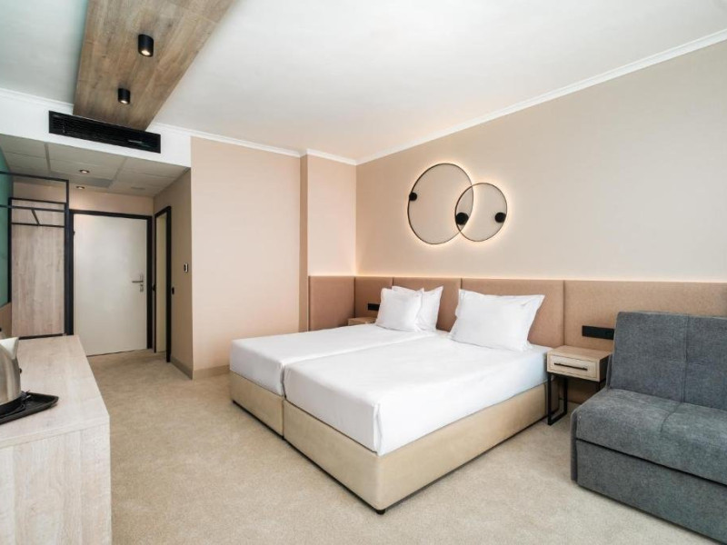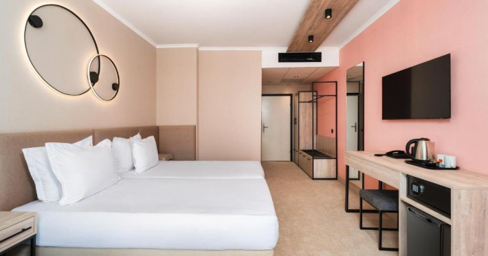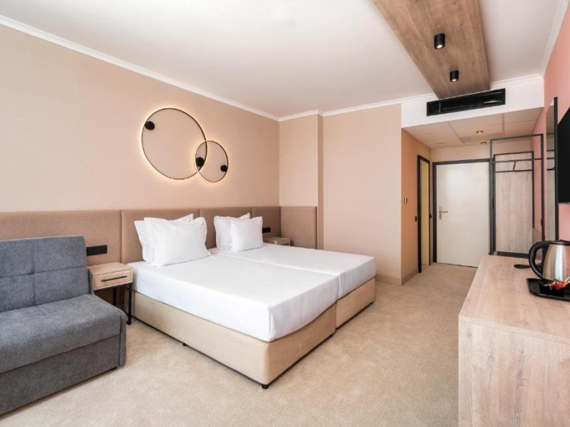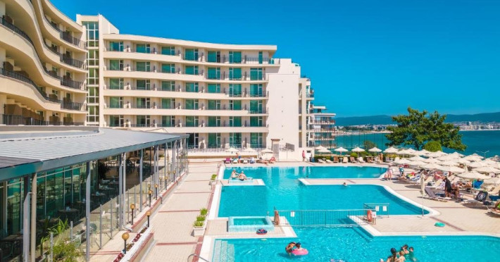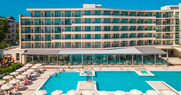 Mancare si bauturi: - Mic dejun /7:30 - 10:00/ - bufet in restaurantul principal - o varietate de preparate calde si reci, specialitati din oua, o varietate de produse lactate, mezeluri si branzeturi, o selectie de produse de panificatie, cereale, fructe, bauturi racoritoare, bauturi calde instant, apa filtrata si o mare varietate de ceaiuri din plante si fructe. - Pranz /12:30 - 14:30/ - la bufet in restaurantul principal - o varietate de preparate calde si reci, o varietate de produse lactate, fructe de sezon, o mare varietate de preparate din bucataria bulgara si internationala. De asemenea, disponibile: vin la draft /alb, rose si rosu/, bere la halba, bauturi alcoolice locale, bauturi racoritoare, bauturi calde instant, apa filtrata si o mare varietate de ceaiuri din plante si fructe. - Cina /18:30 - 21:00/ - la bufet in restaurantul principal - o mare varietate de preparate calde si reci, salate crocante, preparate cunoscute din bucataria internationala, deserturi usoare, fructe proaspete, legume la gratar, paste si la gratar delicii la statia de show-cooking. De asemenea, disponibile: vin la draft /alb, rose si rosu/, bere la halba, bauturi spirtoase locale, bauturi racoritoare, bauturi calde instant, apa filtrata si o mare varietate de ceaiuri din plante si fructe. *Bufete tematice de trei ori pe saptamana - seara traditionala bulgara, italiana, mexicana sau mediteraneana.