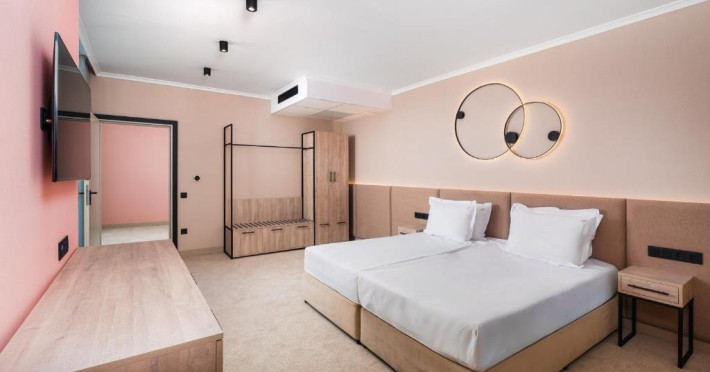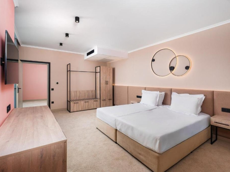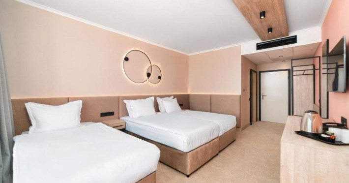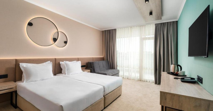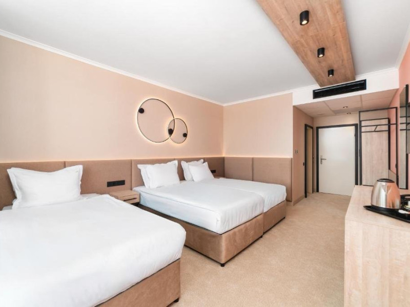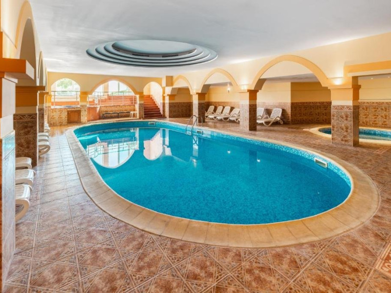 Sport si divertisment: Piscina exterioara cu sezlonguri si umbrele /sezoniere, deschisa 20.05-15.09/ Fitness si fitness pe strada Piscina interioara Animatie Wifi Loc de joaca multifunctional Seif Sauna si baie de aburi - rezervare cu minim 1 ora inainte de utilizare