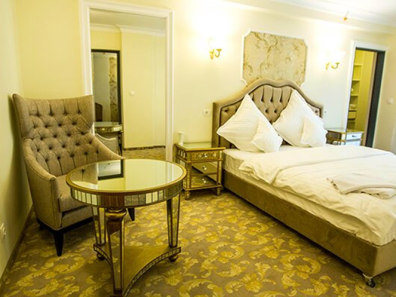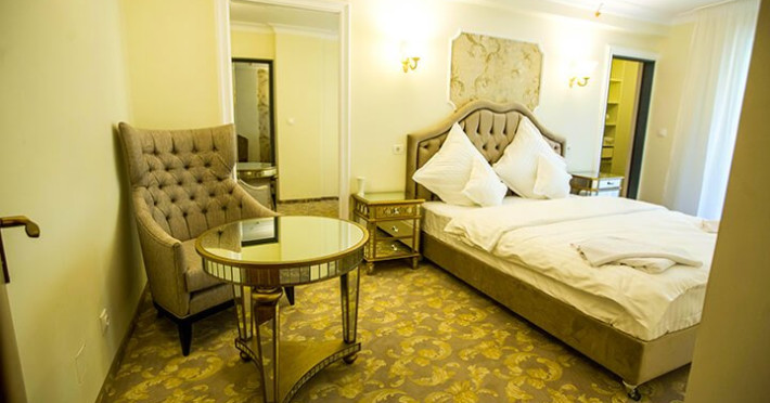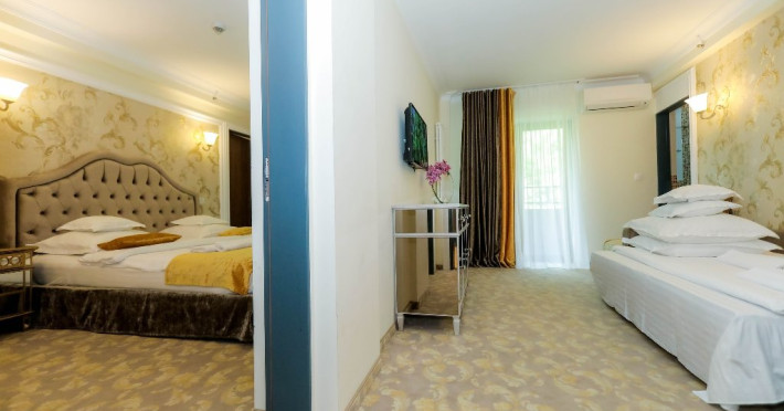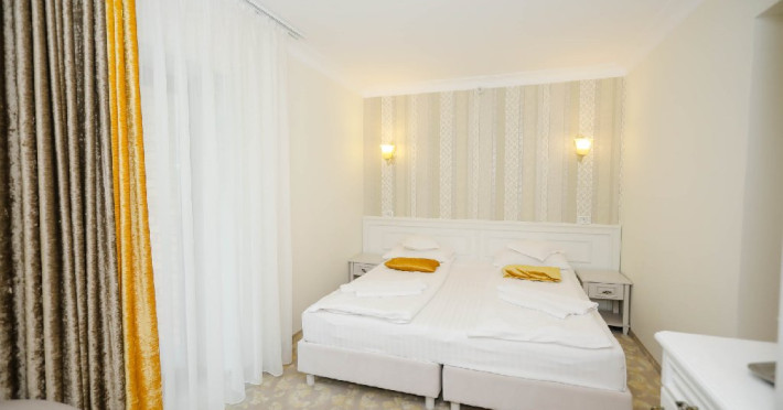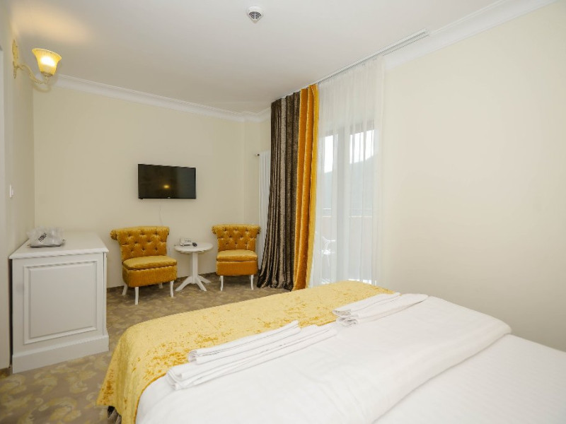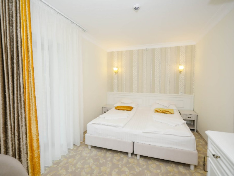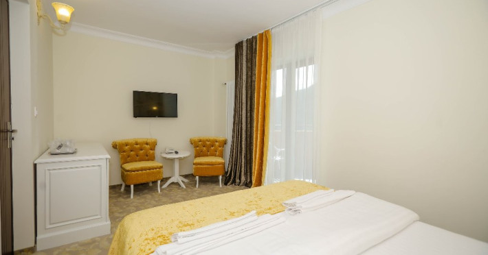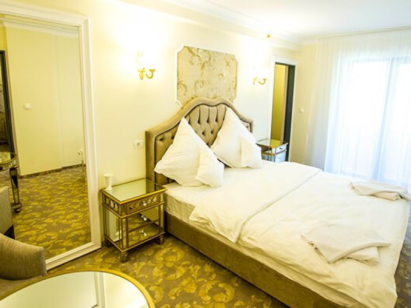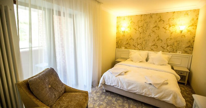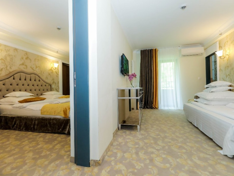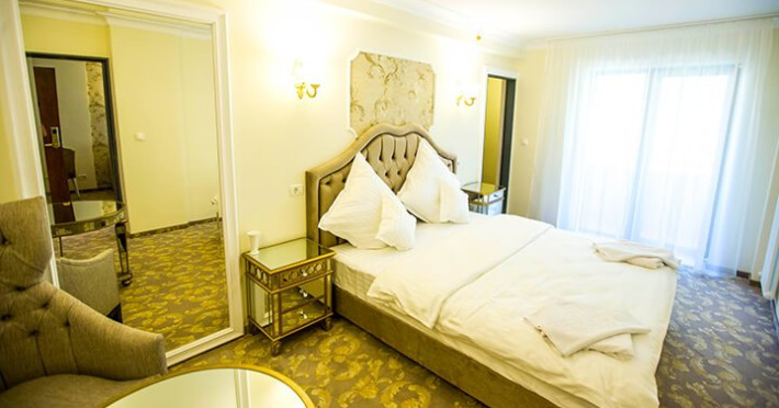 DESCRIERE CAMERE Duble: 164 - 114 camere matrimoniale, 50 camere twin Apartamente: 13 - Acestea ofera un spatiu de cazare divizat intr-un living spatios cu canapea extensibila si un dormitor matrimonial, alaturi de un dressing generos. Suite: 8 - compuse din doua camere comunicante, concepute special pentru familiile cu copii, ofera un salon cu canapea extensibila, birou de lucru, minibar, tv, wireless dar si dormitoare in varianta matrimoniala. Papucii, halatele, uscatorul, produsele cosmetice sunt doar cateva elemente ce se regasesc in baile dvs, pe langa cele doua balcoane aferente suitelor, care va vor incanta simturile prin aportul de aer proaspat de munte si peisaje deosebite, in orice moment din zi sau din seara.