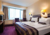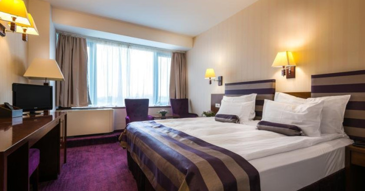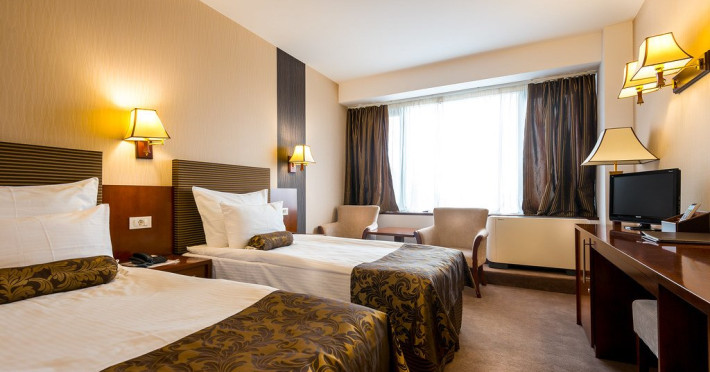 DESCRIERE CAMERE Hotelul are 150 de camere de diferite tipuri si 4 apartamente, toate dotate cu cele mai noi facilitati. Camerele ofera o vedere spectaculoasa spre Cluj Arena sau spre centrul orasului. Dotari generale camere: aer conditionat, baie cu dus - sau cada, uscator de par, telefon, birou. Hotelul dispune si de camere de tip family - cu usa comunicanta intre ele (o camera matrimoniala + camera cu canapea extensibila) si apartamente compuse din living cu canapea fixa si dormitor.