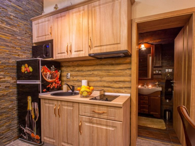 Living-ul-bucatarie este amenajat cu o zona de servire a mesei, si dotat cu frigider, cuptor cu microunde, plita electrica, vesela, pahare si masina de spalat.