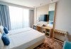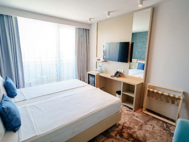 O camera confortabila in care spatiul si designul au fost prioritare. Patul confortabil cu salteaua de dimensiuni de 1.80, culorile inspirate de malul marii si calitatea materialelor folosite ofera linistea necesara pentru relaxare. Lenjeriile din 100% bumbac, precum si celelalte materiale folosite asigura confortul necesar vacantei.