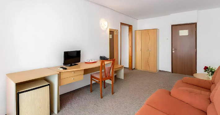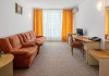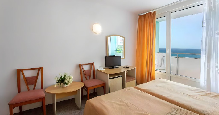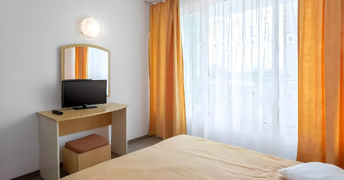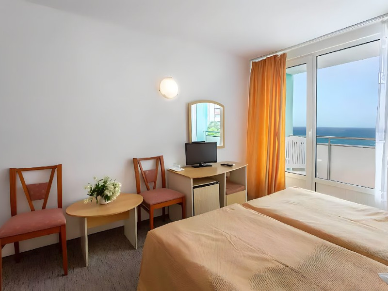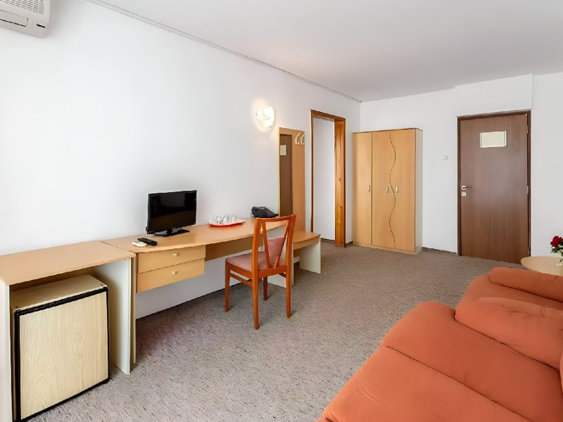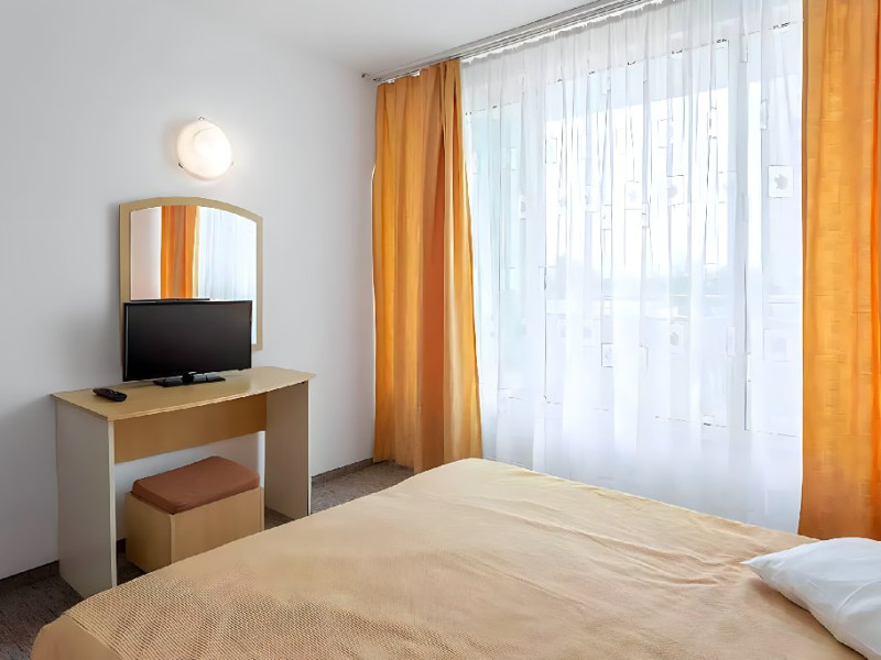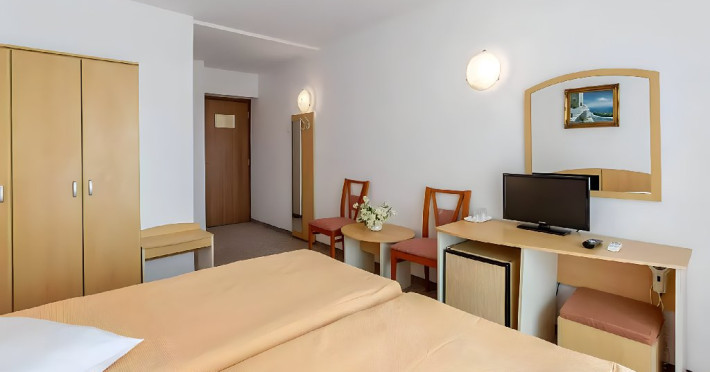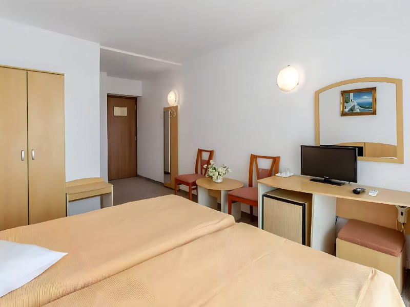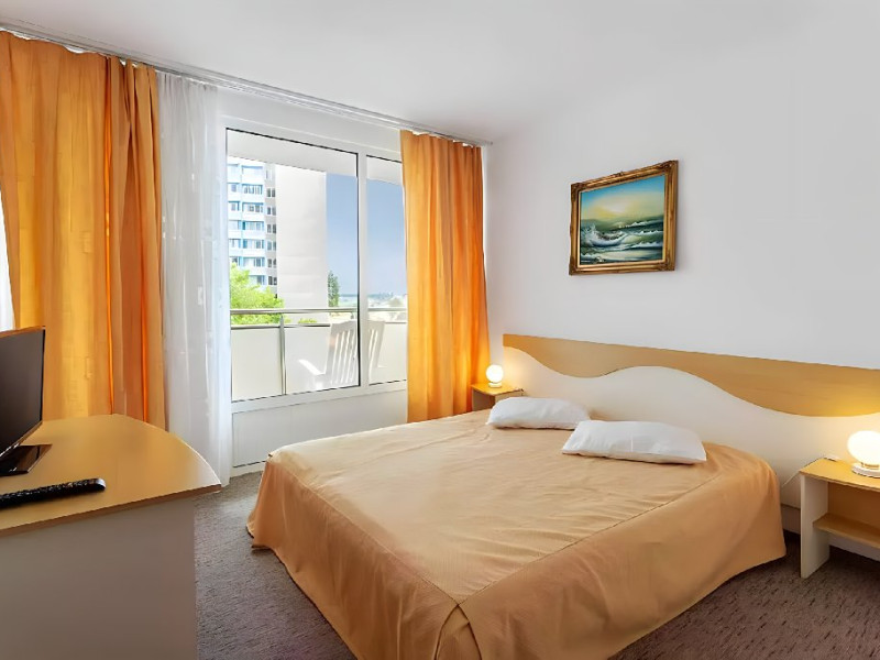 DESCRIERE CAMERE Dotari camere: aer conditionat, TV, minibar, baie cu dus, balcon, uscator de par. Numar total camere: 283 Duble: 269 - camere cu paturi twin. Apartamente: 4 - sunt compuse din living cu canapea extensibila si dormitor cu pat matrimonial.