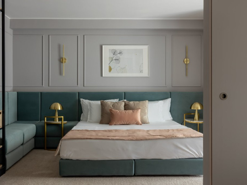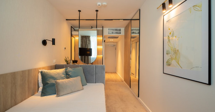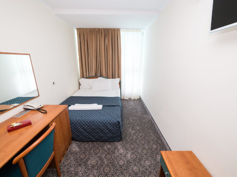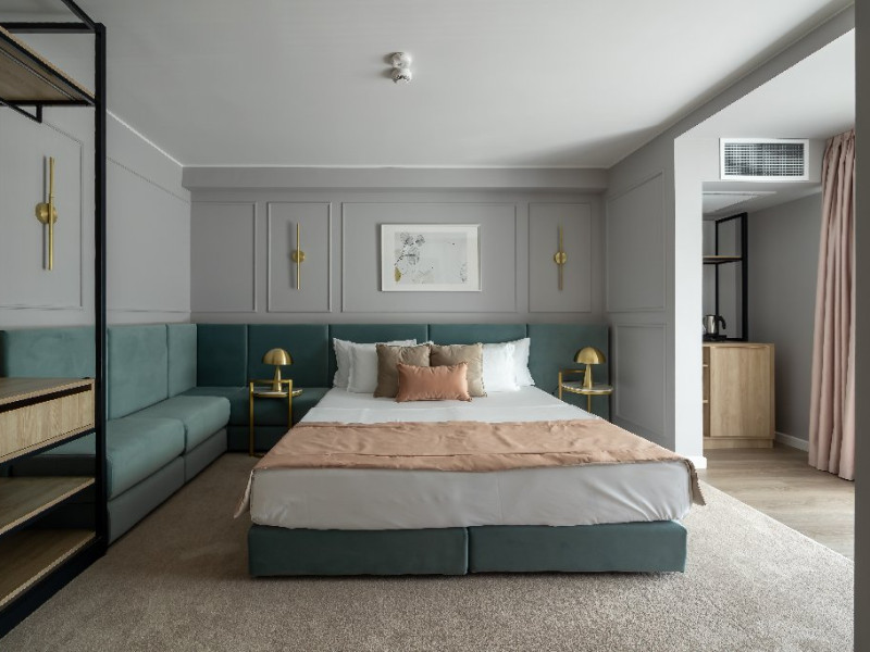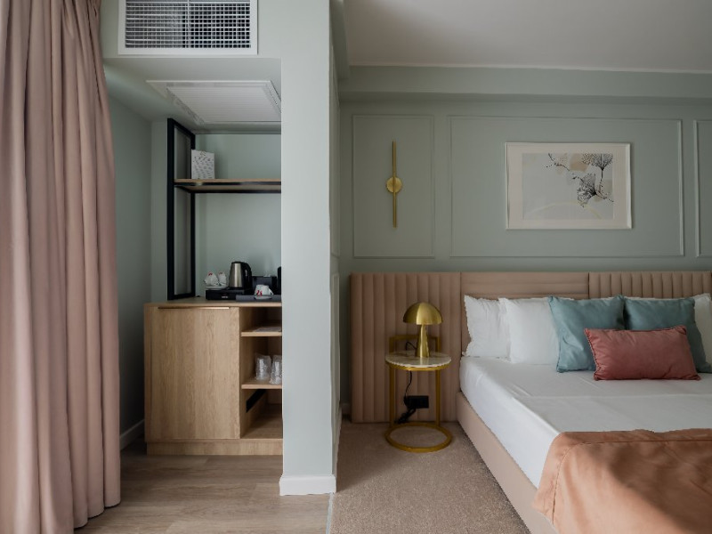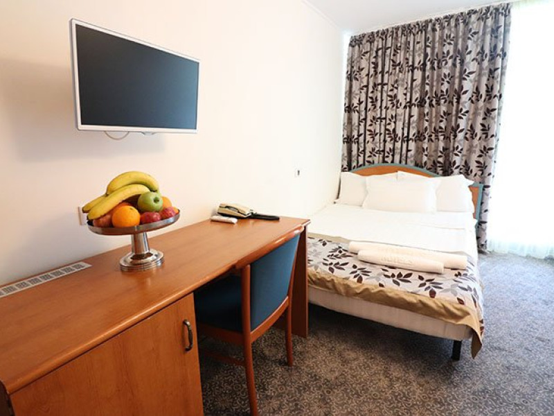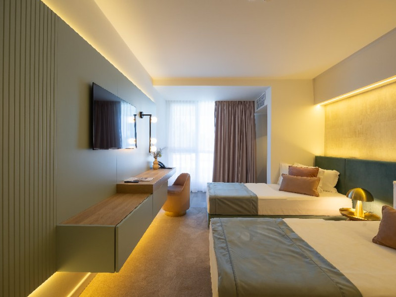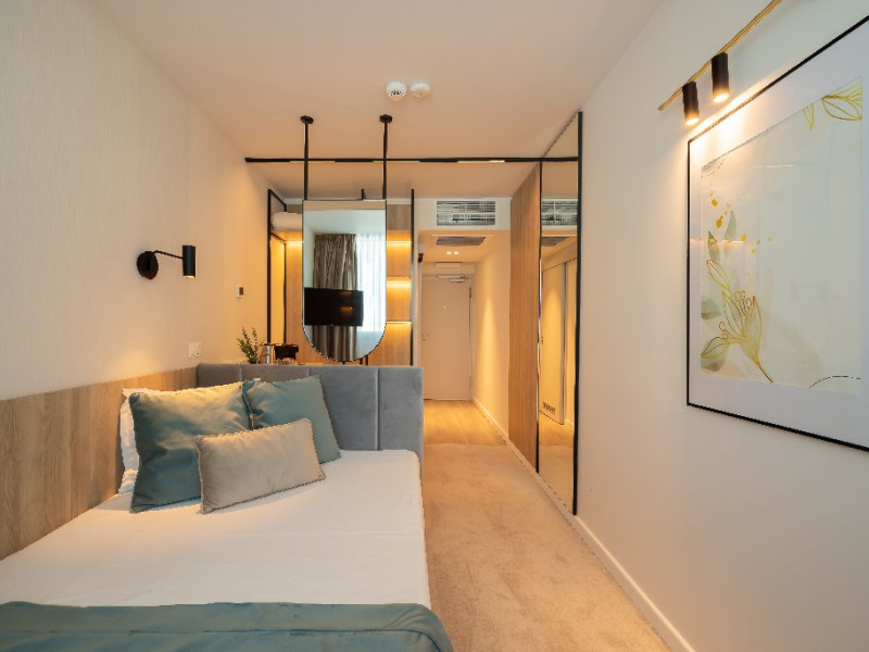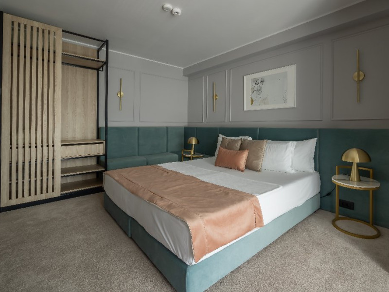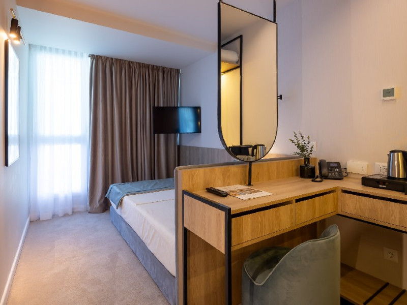 DESCRIERE CAMERE Numar total camere: 139 Single: 37 Duble: 44 - dintre care 32 camere duble standard si 12 camere duble deluxe. Apartamente: 4 Garsoniere: 54 Hotelul dispune de 123 de camere de 4* si 16 camere de 5*. In plus, intreg ultim etaj de cinci stele, vine si cu o poveste aparte, intrucat fiecare camera este o calatorie catre o tara a lumii, fiind decorata dupa chipul si asemanarea tarii respective. Fiecare camera a etajului 5 a fost gandita avand la baza conceptul de tari care prin intermediul gamei de culori si a mobilierului modern, elegant si personalizat, va vor purta intr-o calatorie in jurul lumii. Concepute pentru a creea armonia pefecta intre relaxare si un mediu de lucru adecvat, cele 16 camere va vor transpune de fiecare data intr-o lume diferita: de la modernismul apartamentului american pana la subtila aroma orientala a apartamentului chinezesc. Camera Single Standard / Vedere La Mare 4* - Spatiu de cazare destinat cazarii unei singure persoane. Suprafata totala de 15 mp. Camera Dubla Standard / Vedere La Mare 4* - Suprafata totala de 18 mp.