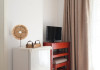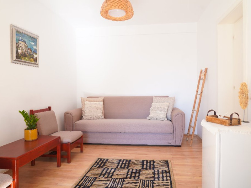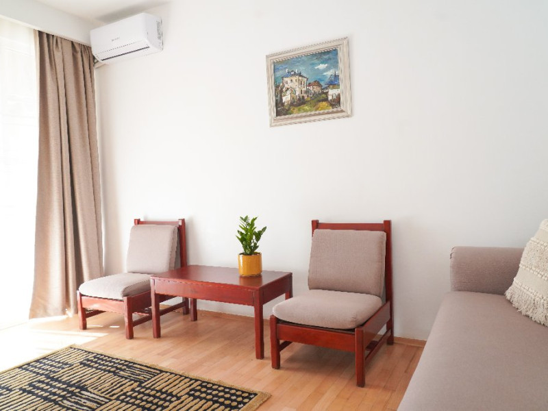 DESCRIERE CAMERE Numar total camere: 24 Apartamente: 24 - apartamentul este compus din living cu canapea extensibila si dormitor cu pat dublu. Suprafata totala a unui apartament este de 34 mp. Dotari camere: aer conditionat, Smart TV, minibar, baie cu cada, uscator de par, balcon, telefon, pardoseala din parchet, internet wireless gratuit. Compartimentarea si mobilarea apartamentelor este perfecta pentru cazarea familiilor cu unu sau doi copii sau pentru grupurile de patru persoane care doresc sa isi petreaca sejurul pe litoral.