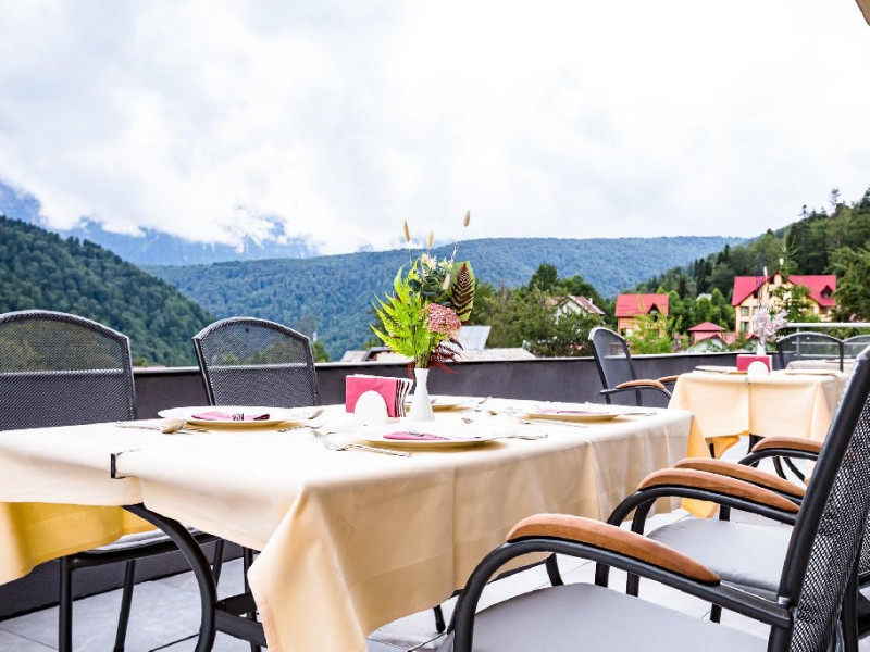 Micul dejun se serveste in salonul de la etajul 1 la hotelului, atat in interior cat si pe terasa cu vedere panoramica.