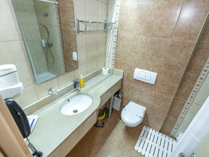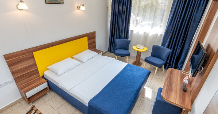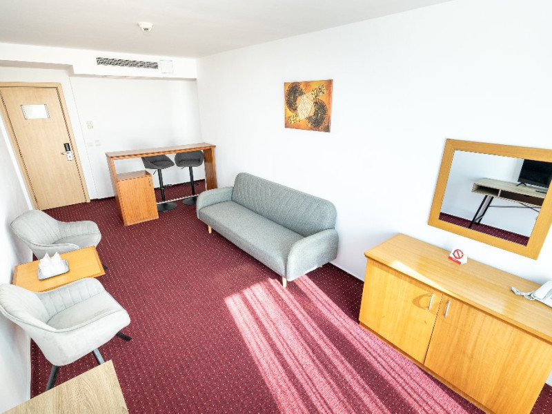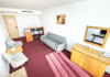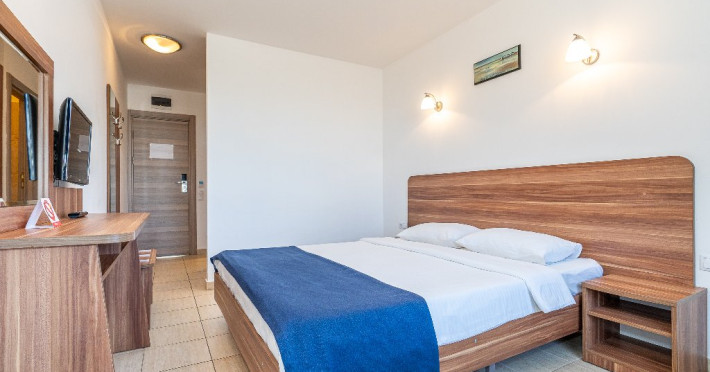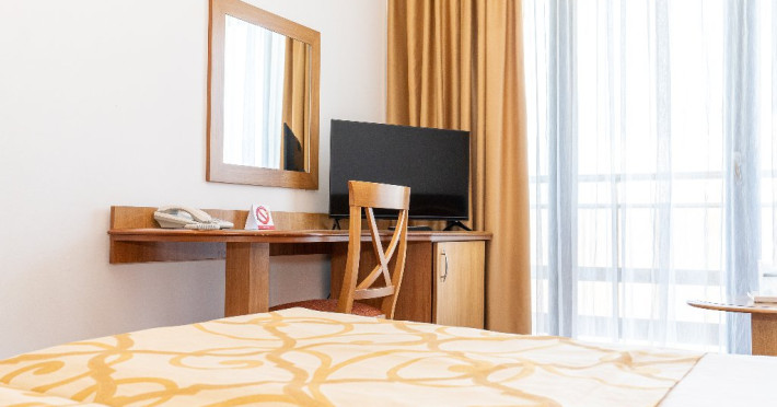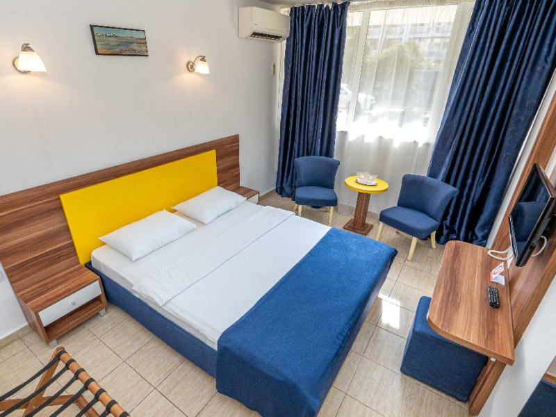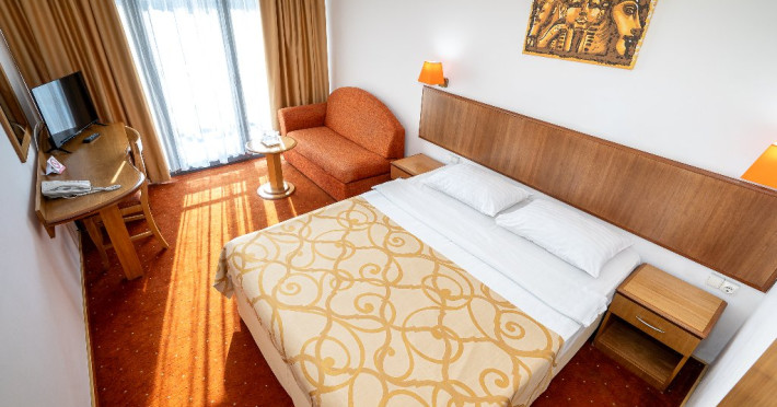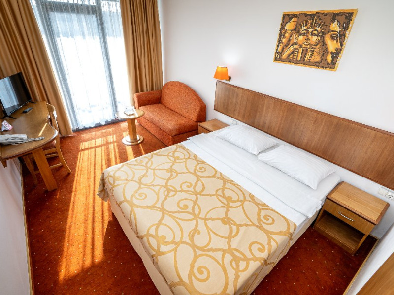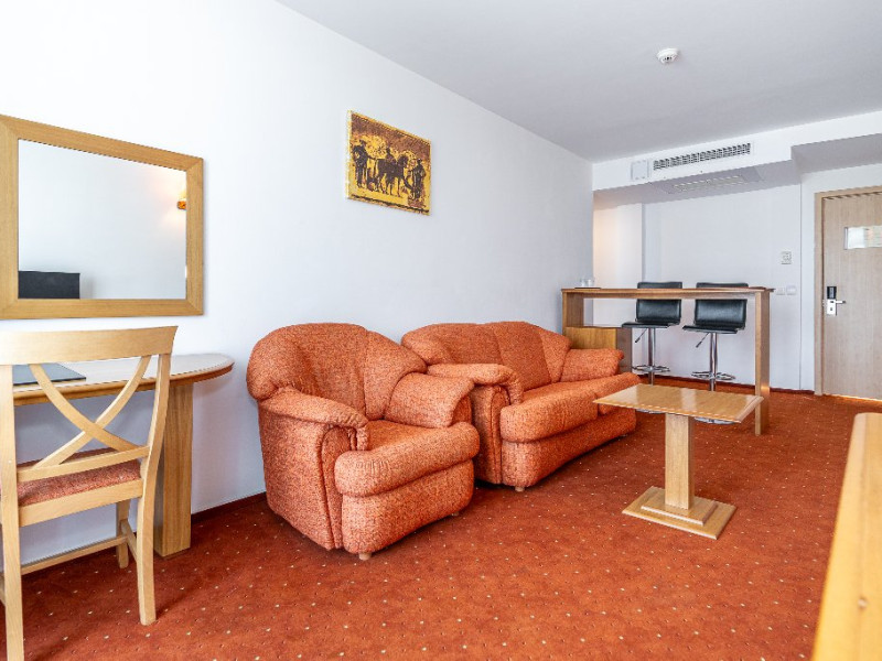 Apartament Hotel Cleopatra, cu o suprafata de 25 mp este compus dintr-un dormitor cu pat matrimonial si un living cu o canapea extensibila. Acest apartament dispune de o singura baie. Recomandare: Apartamentul poate gazdui pana la 3 adulti sau 2 adulti si 2 copii. Dotari: sistem de acces in camera pe baza de cartela, aer conditionat, TV LCD, telefon, seif, baie cu cabina de dus, uscator de par, cosmetice hoteliere, balcon cu mobilier de terasa.