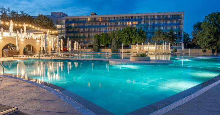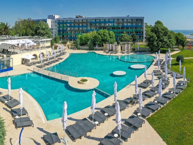 INFORMATII GENERALE SAFIR BLUE RESORT este este alcatuit din 2 hoteluri Cleopatra (3* - 277 camere), Narcis (3* - 320 camere) Cele 2 hoteluri dispun de o curte comuna cu peste 1 hectar de gazon, o piscina generoasa de peste 1.500 mp, precum si de o plaja privata de peste 5.000 mp.