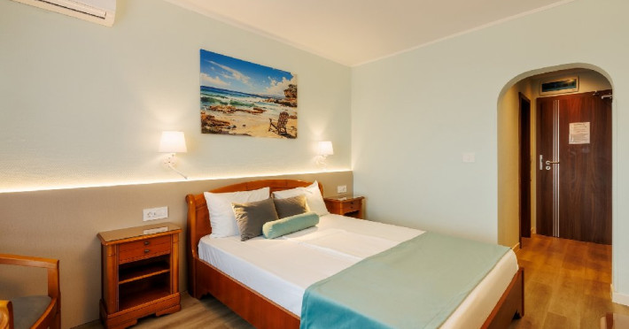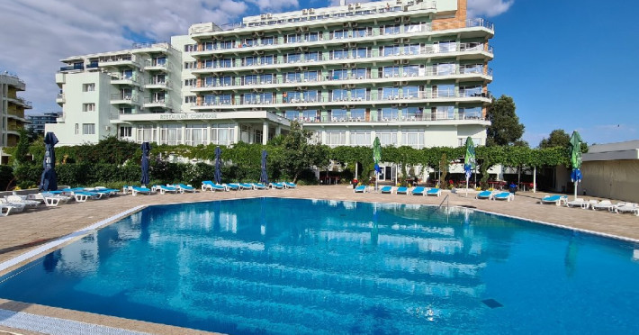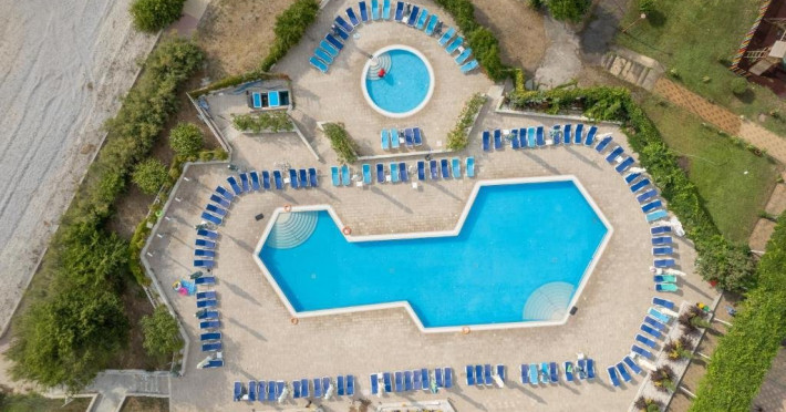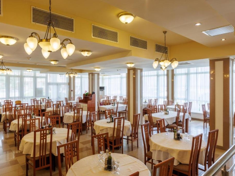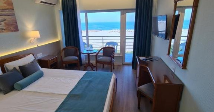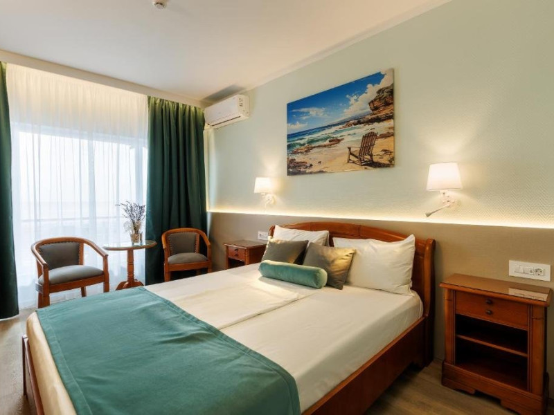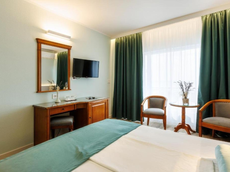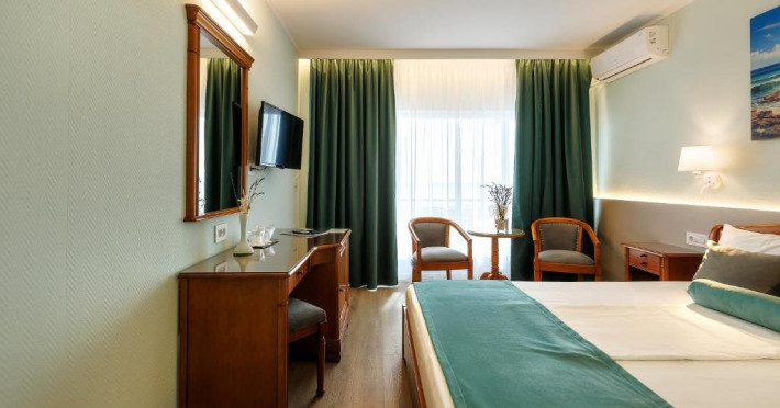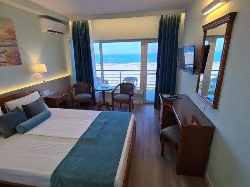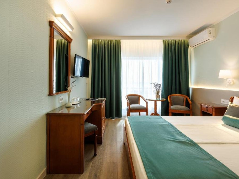 DESCRIERE CAMERE Numar total camere: 126 Duble: 120 - dintre care 82 camere cu pat matrimonial si 38 cu doua paturi. Apartamente: 6 - apartamentul este compus din living cu canapea extensibila si dormitor, dispune de terasa. Dotari camere: aer conditionat, TV, minibar, seif -electronic, baie cu dus, balcon, internet -gratuit, uscator de par, telefon, pardoseala din gresie antiderapanta. LOCALIZARE Hotelul este situat in nordul statiunii, pe plaja. Plaja: larga, nisipoasa cu intrare lina in mare.
