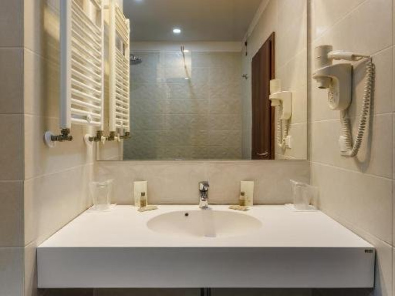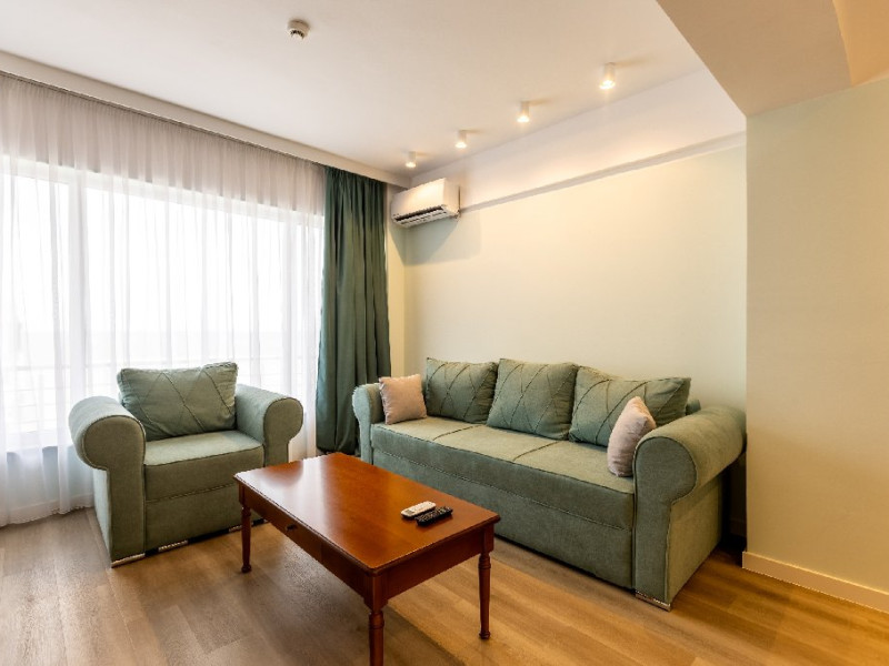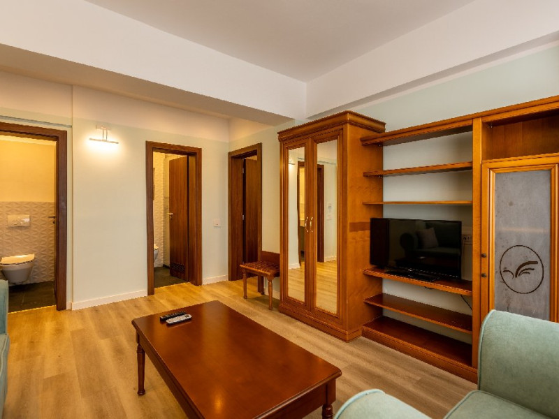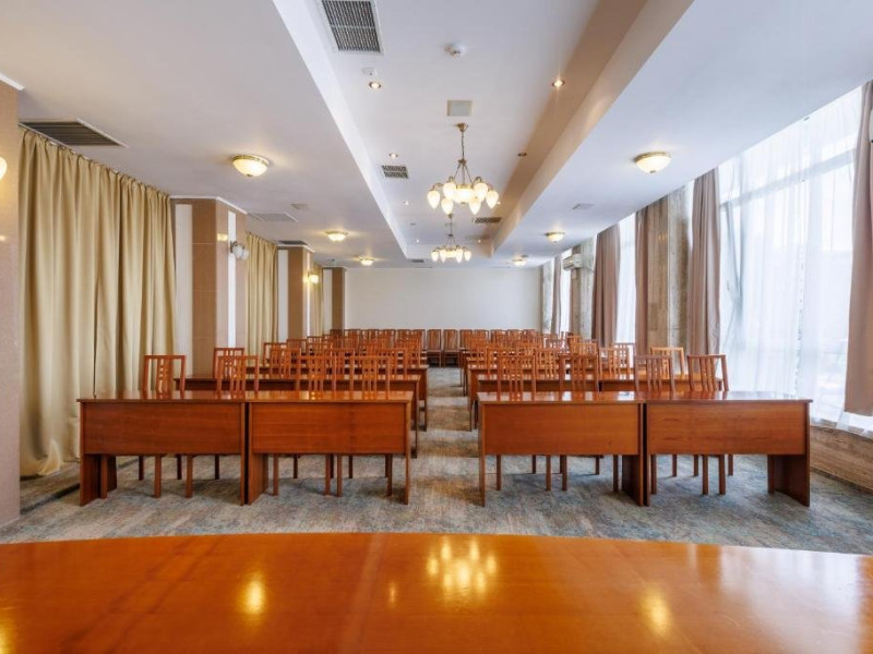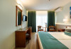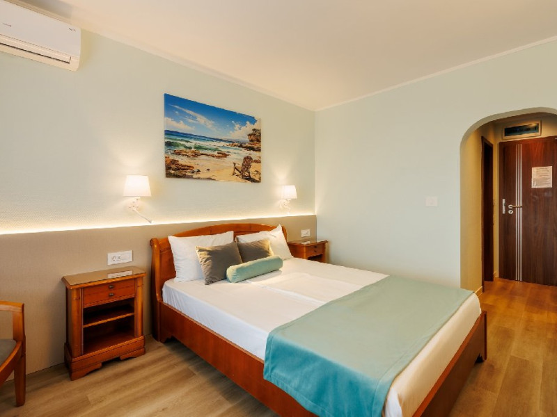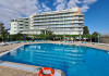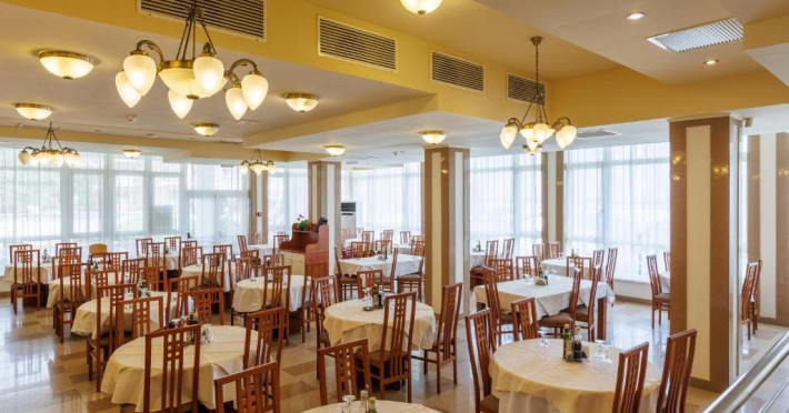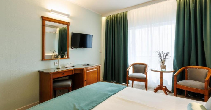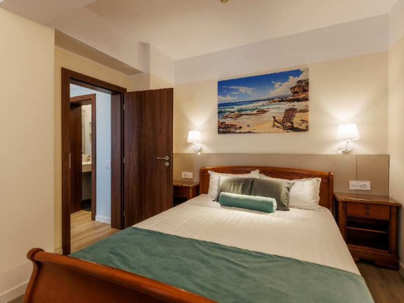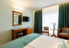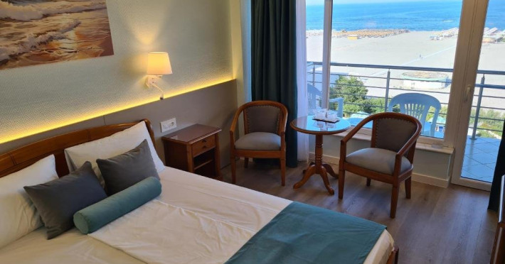 DESCRIERE CAMERE Numar total camere: 126 Duble: 120 - dintre care 82 camere cu pat matrimonial si 38 cu doua paturi. Apartamente: 6 - apartamentul este compus din living cu canapea extensibila si dormitor, dispune de terasa. Dotari camere: aer conditionat, TV, minibar, seif -electronic, baie cu dus, balcon, internet -gratuit, uscator de par, telefon, pardoseala din gresie antiderapanta. LOCALIZARE Hotelul este situat in nordul statiunii, pe plaja. Plaja: larga, nisipoasa cu intrare lina in mare.