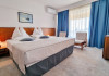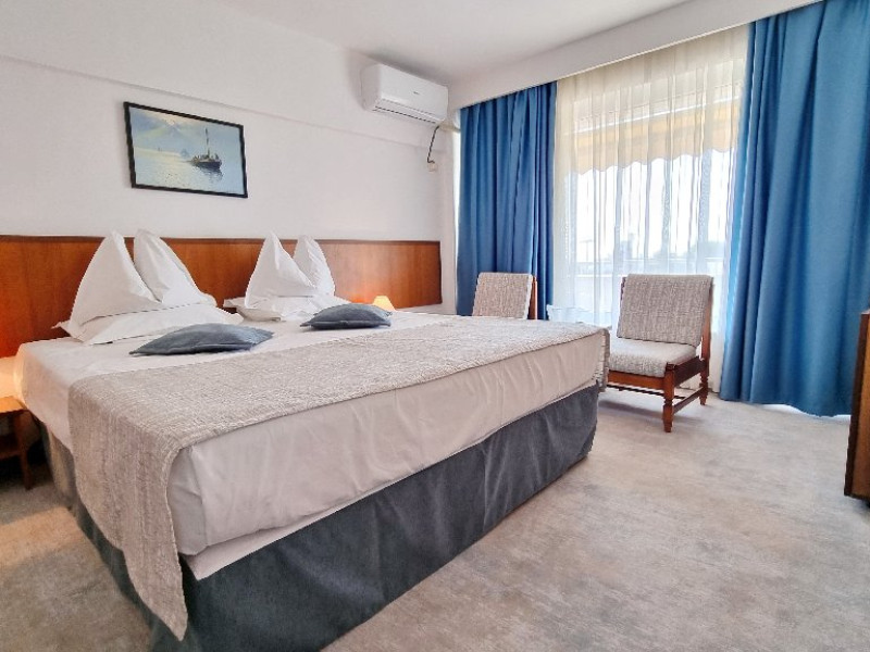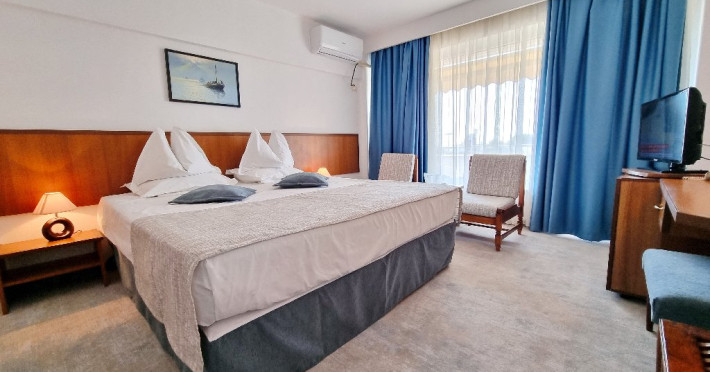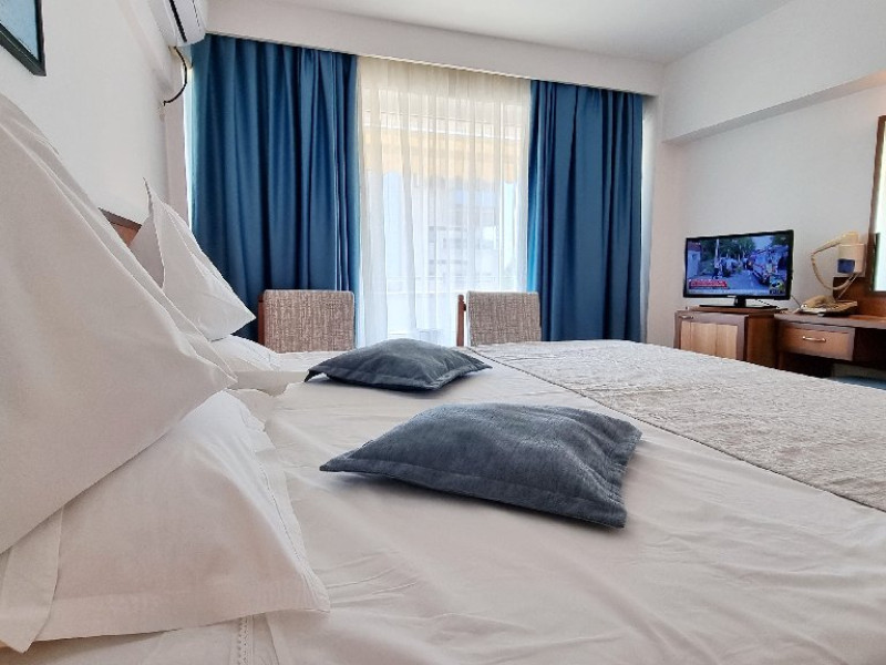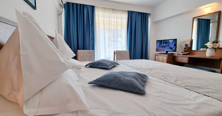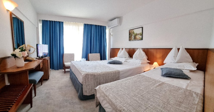 DESCRIERE CAMERE Dotari camere: aer conditionat, TV, minibar, seif, baie cu cada -doar camerele single, baie cu dus -si telefon, balcon, internet -wireless, uscator de par, telefon, acces pe baza de cartela magnetica. Numar total camere: 139 Single: 6 Duble: 131 Apartamente: 2 - apartamentul este compus din living si dormitor.