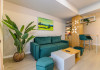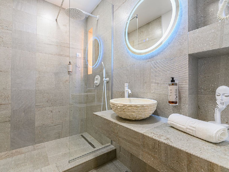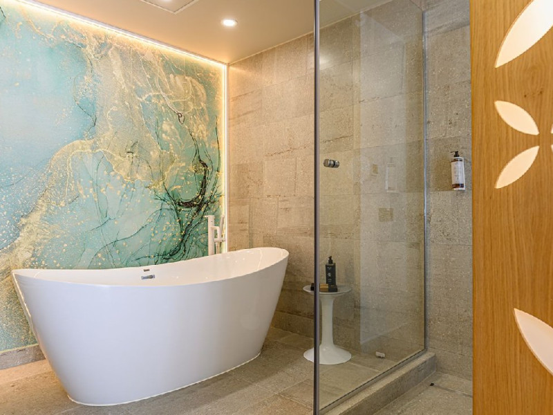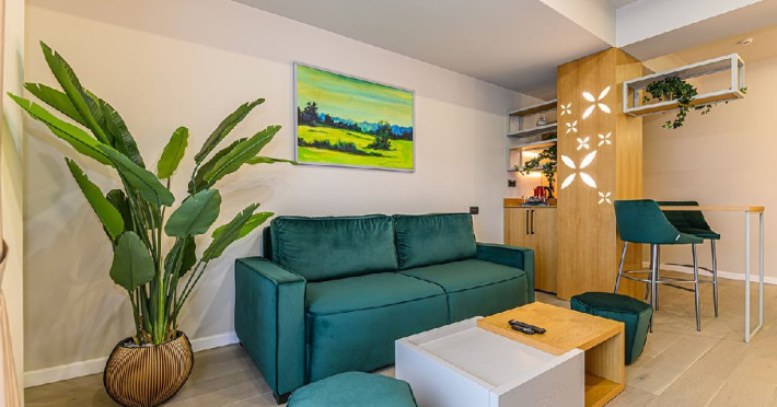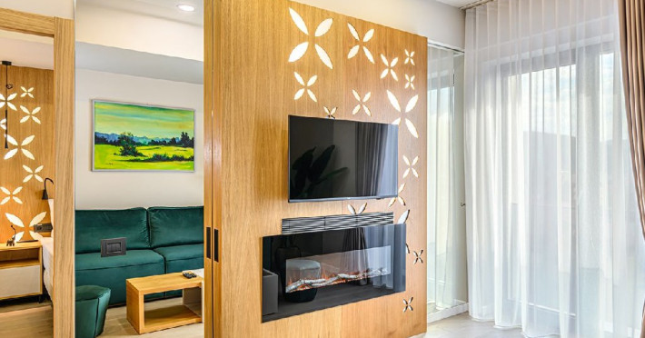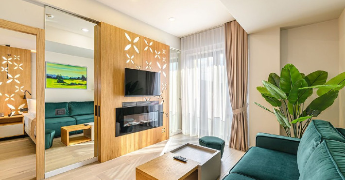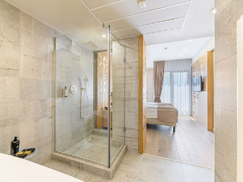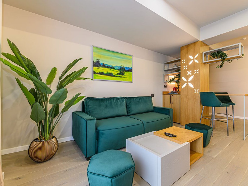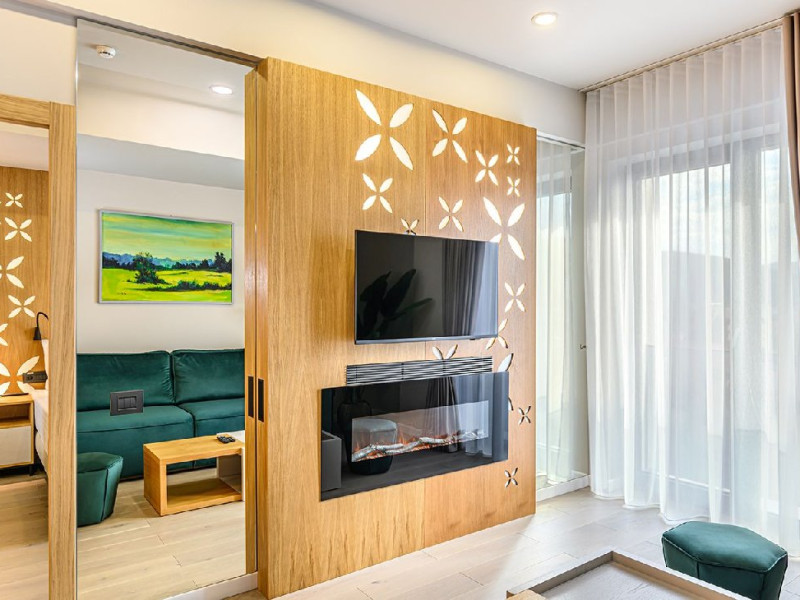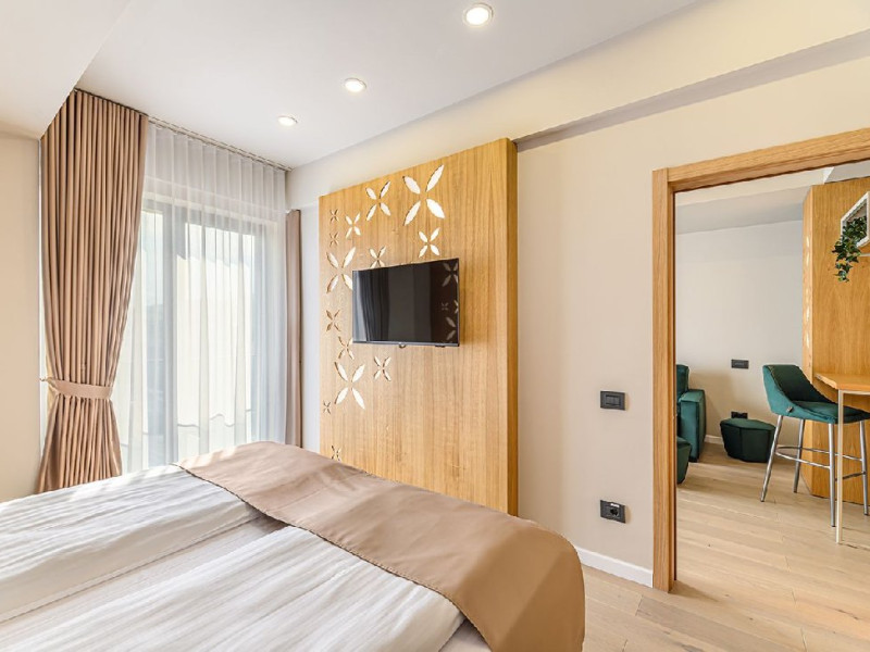 Apartament Junior Suite are o suprafata de 40 m2, cu aer conditionat, uscator de par, minibar, telefon si TV LCD, halat de baie, fierbator, papuci, semineu. Dimensiune pat: 180 cm x 200 cm si 160 cm x 200 cm. Apartamentul dispune de 3 bai. Pentru ca rasfatul sa fie total, baia cu cada design amplasata in fata unui perete din granit turquoise cu insertii albe si negre, apartine exclusiv dormitorului, este la fel de eleganta, cu placi de granit crem, accesorii metalice luxoase, si un decor care sa inspire relaxarea prin luminile ambientale care pot fi setate. Alte 2 bai din care una de serviciu si una dotata cu dus sunt si ele parte din elegantul apartament.