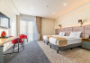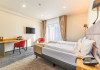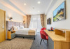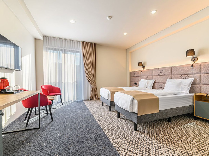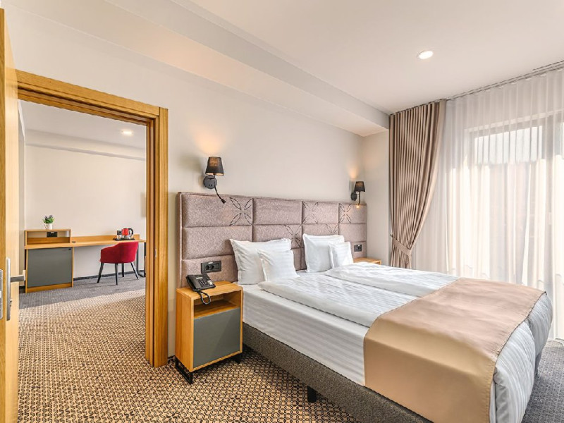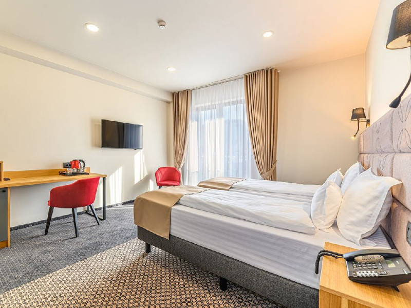 Camera dubla Executive Matrimoniala are o suprafata de 28 m2 toate cu aer conditionat, dotate cu baie cu dus, uscator de par, minibar, telefon si TV LCD, halat de baie, fierbator, papuci, fotoliu extensibil. Dimensiune pat: 180 cm x 200 cm.
