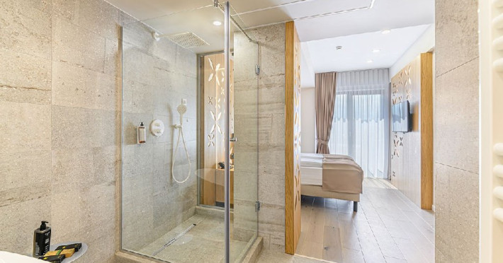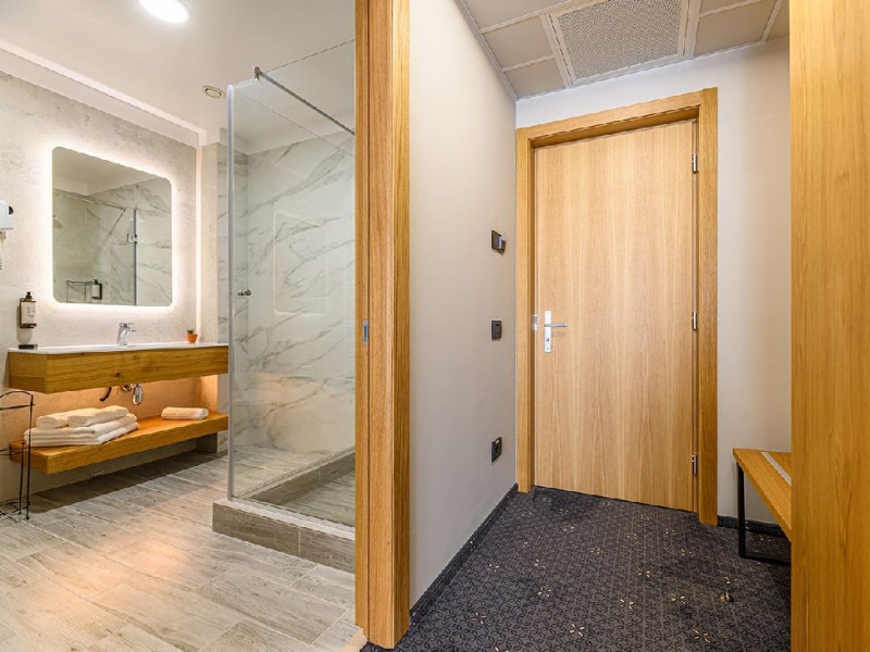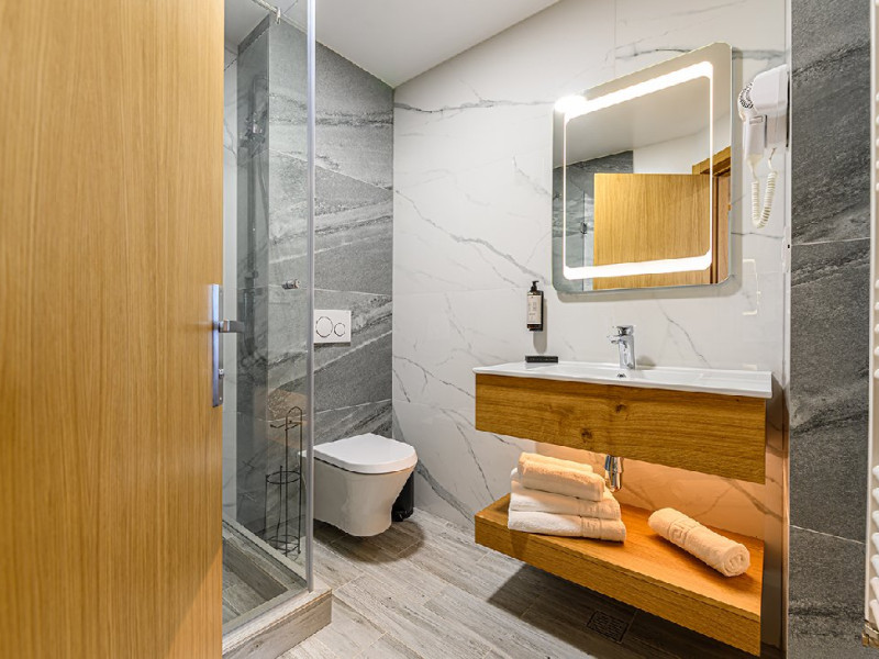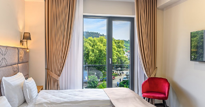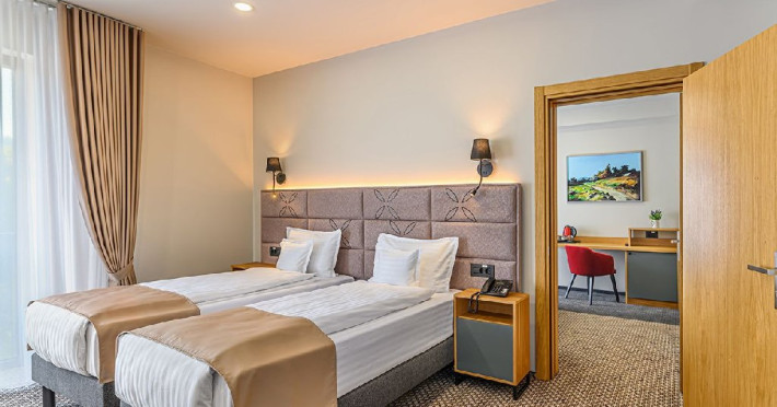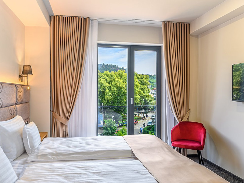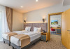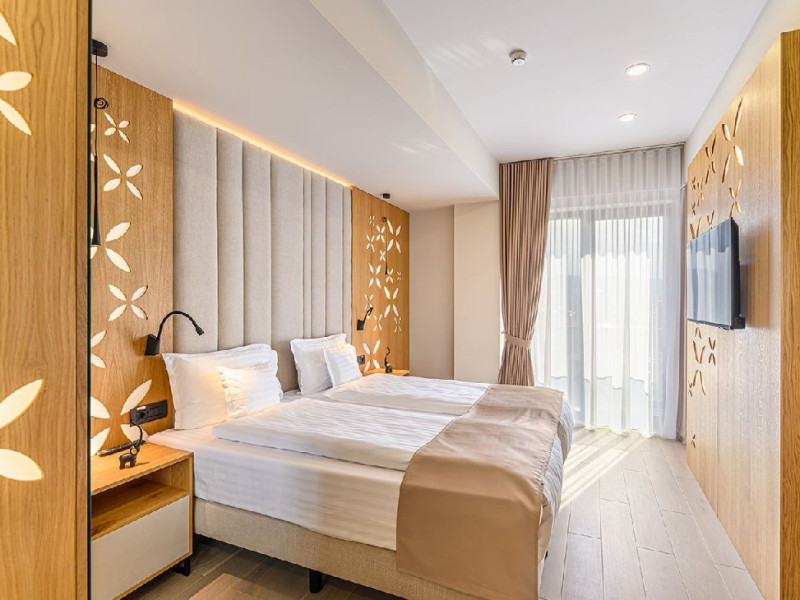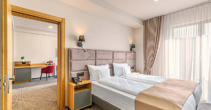 Camera dubla Superiora Matrimoniala are o suprafata de 26 m2 toate cu aer conditionat, dotate cu baie cu dus, uscator de par, minibar, telefon si TV LCD, halat de baie, fierbator, papuci. Dimensiune pat: 180 cm x 200 cm.