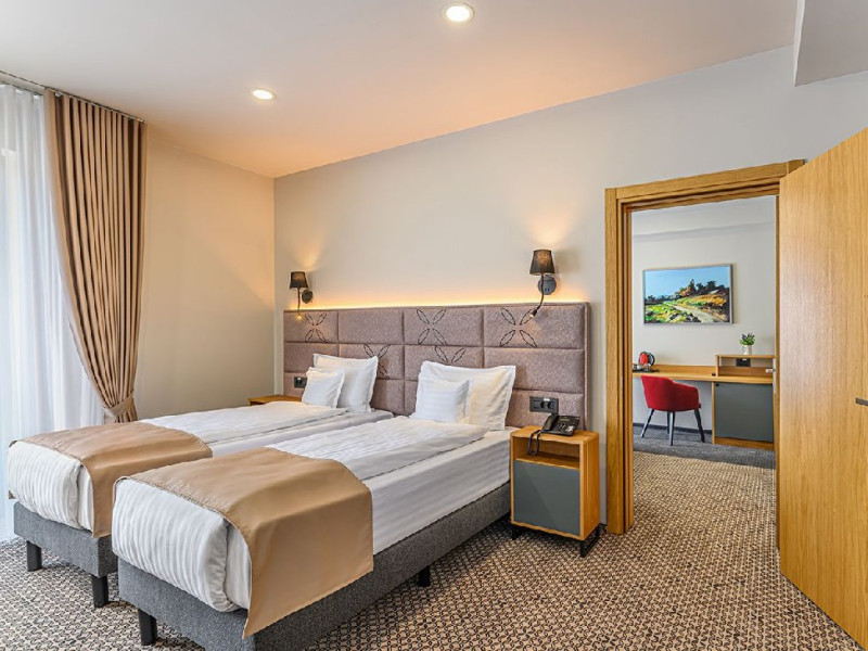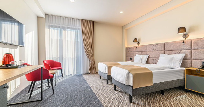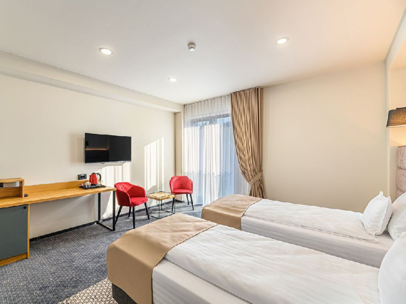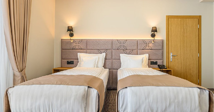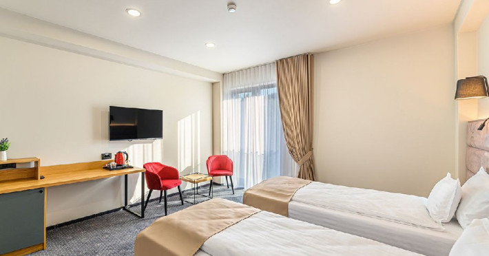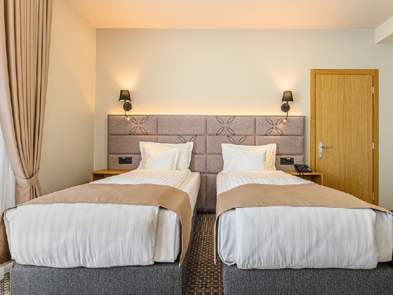 DESCRIERE CAMERE Camera dubla Superioara Twin are o suprafata de 26 m2 toate cu aer conditionat, dotate cu baie cu dus, uscator de par, minibar, telefon si TV LCD, halat de baie, fierbator, papuci. Dimensiune pat: 2 x 90 cm x 200 cm.