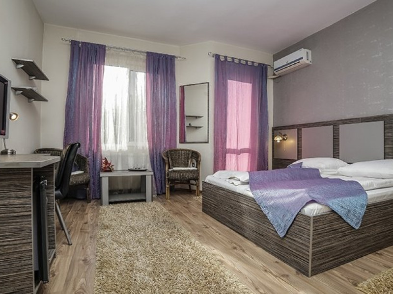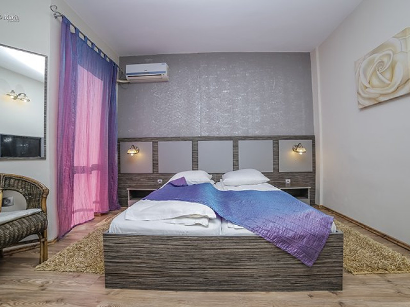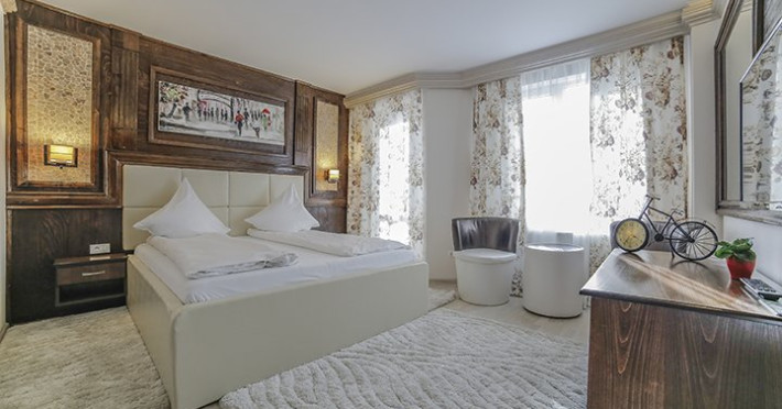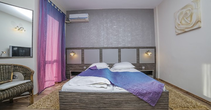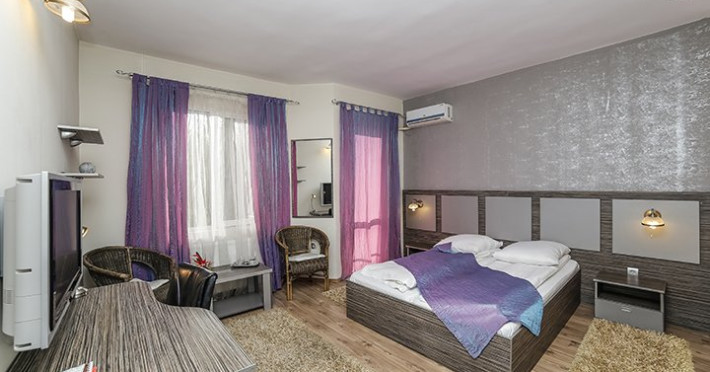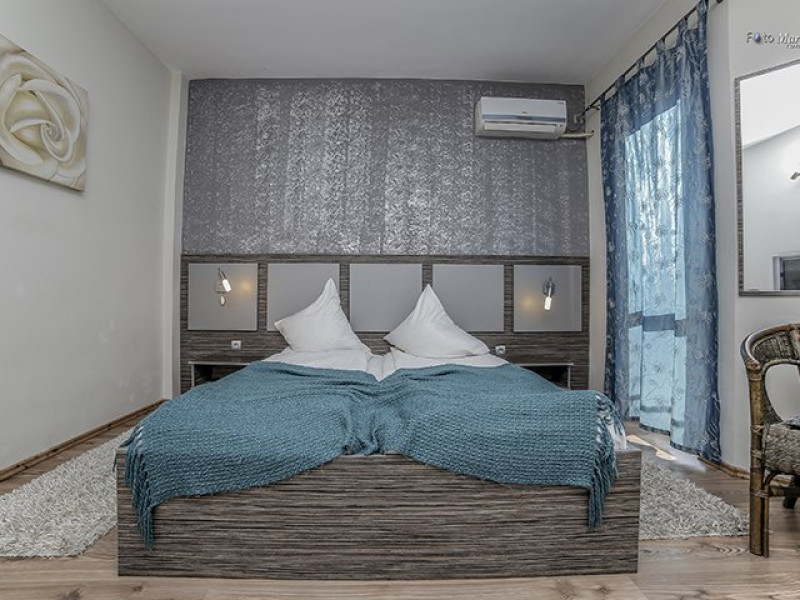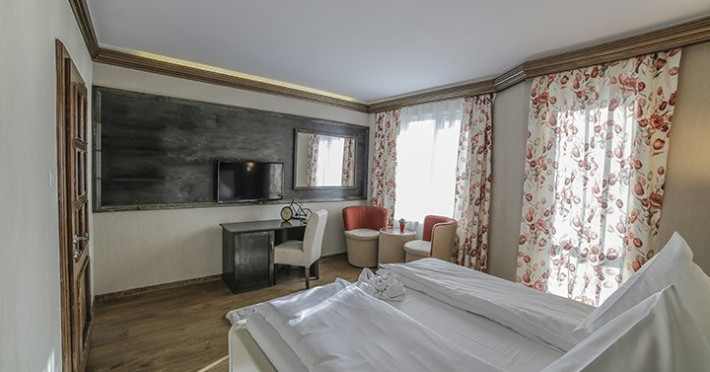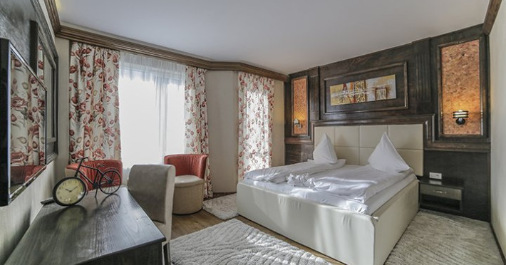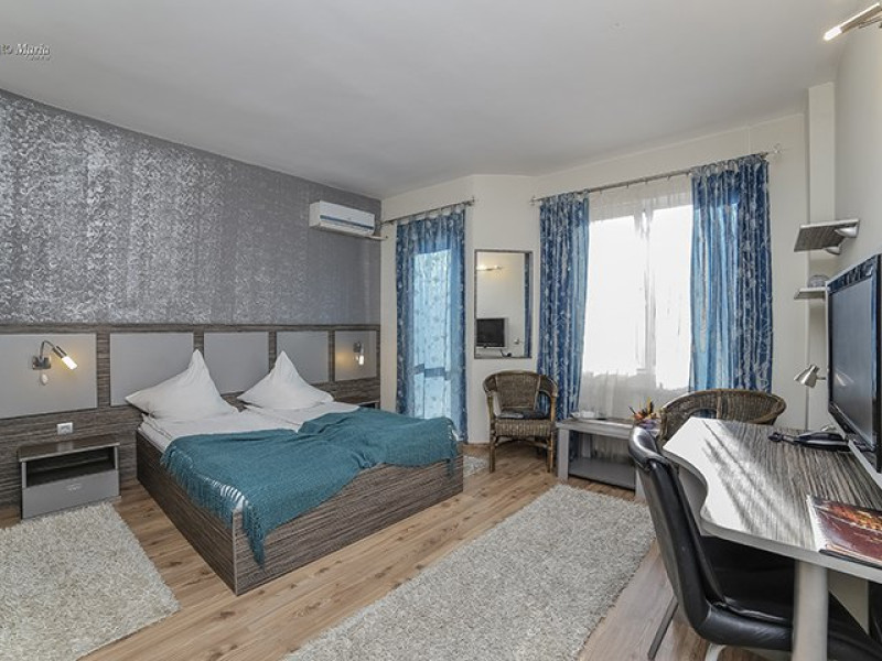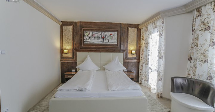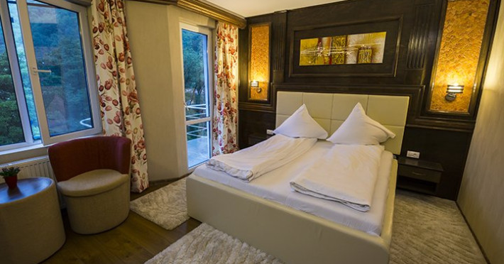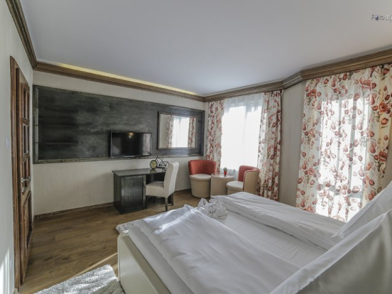 Camera dubla confort cu jacuzzi - camere elegante, cu mobilier din lemn masiv si un design special, dispunand de balcon, birou de lucru,televizor LCD, cada cu hidromasaj, uscator par.