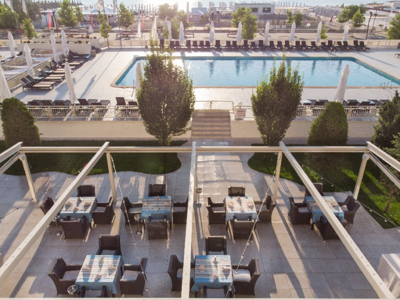 FACILITATI UNITATE Dotari generale: restaurant, parcare proprie -exterioara (gratuita) pentru 60 de masini si garaj subteran-35 locuri (contra cost), piano-bar (50 locuri).Piscinele exterioare: renovate in 2024, sunt dotate cu un sistem de filtrare si incalzire a apei (mai-septembrie, min. 15C), fiind concepute pentru intreaga familie, cu zone separate pentru adulti si copii, dusuri di pool bar. Centrul de conferinte ofera o sala principala care poate fi compartimentata prin pereti modulari in trei spatii distincte, cu capacitati de 50, 100 si 150 de locuri. Completarea recenta cu doua sali dedicate intalnirilor private, Londra si Praga, extinde posibilitatile pentru evenimente business de diverse dimensiuni. La un cost suplimentar, oaspetii au acces la un Centru Spa elegant cu piscina interioara incalzita, saune uscate si umeda, jacuzzi, zona de fitness, dusuri cervicale. Se ofera si servicii de masaj, cu confirmare prealabila. In perioada 23.06-06.07.2025, Centrul Spa va fi inchis pentru intretinerea anuala. Hotelul are o statie de incarcare a masinilor electrice EnelX care poate incarca 2 masini in acelasi timp In imediata vecinatate a hotelului, la 20m, plaja privata ofera sezlonguri confortabile, servicii de masaj marca Iaki SPA, dar si un Beach Bar. IAKI Conference Spa Hotel pune la dispozitia oaspetilor trei restaurante elegante, care ofera experiente culinare variate, adaptate atat pentru mese a la carte, cat si pentru evenimente private. Restaurant Ballroom cu o capacitate de 200 de locuri, ofera bucatarie internationala si servire a la carte, avand acces direct la terasa exterioara, perfecta pentru momente relaxante in aer liber. Restaurant Casino, un spatiu elegant cu 150 de locuri, dedicat evenimentelor private precum nunti, botezuri sau petreceri corporate, cu meniuri personalizate si servicii de inalta calitate. Restaurant Coriolis cu 120 de locuri, este locul ideal pentru mic dejun, pranz sau sau cina intr-un cadru rafinat, oferind preparate internationale si locale, intr-o atmosfera primitoare.