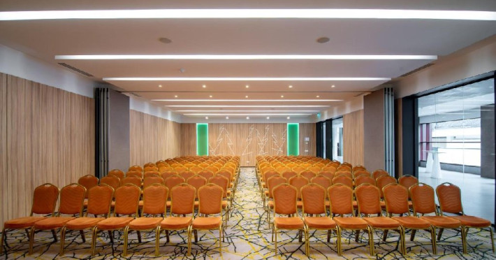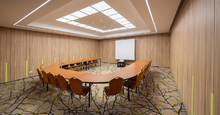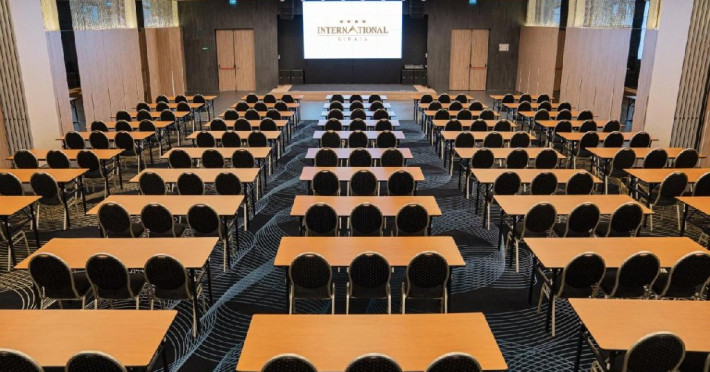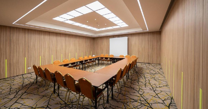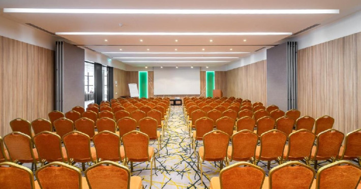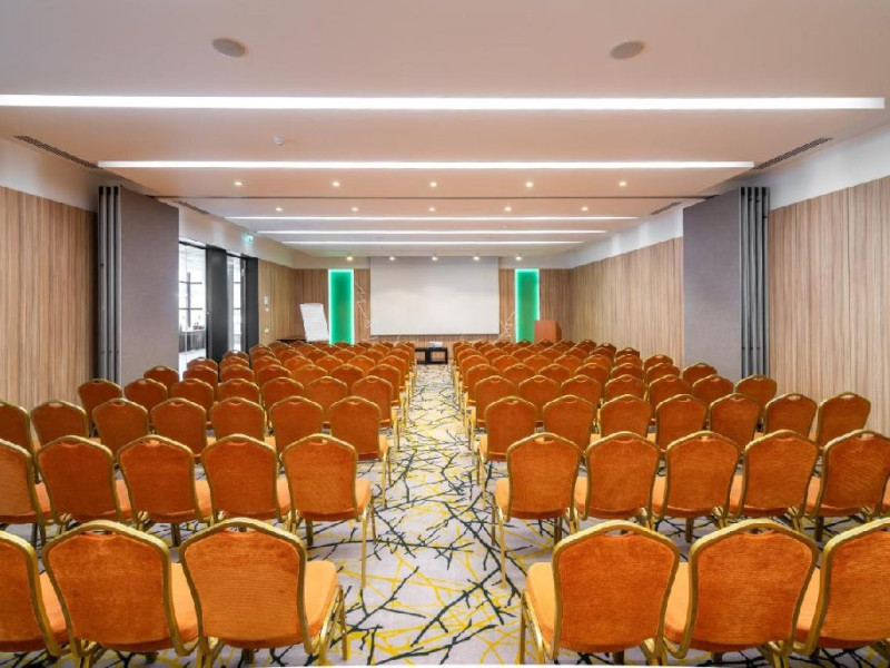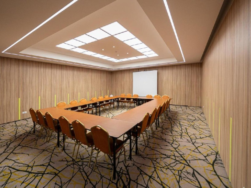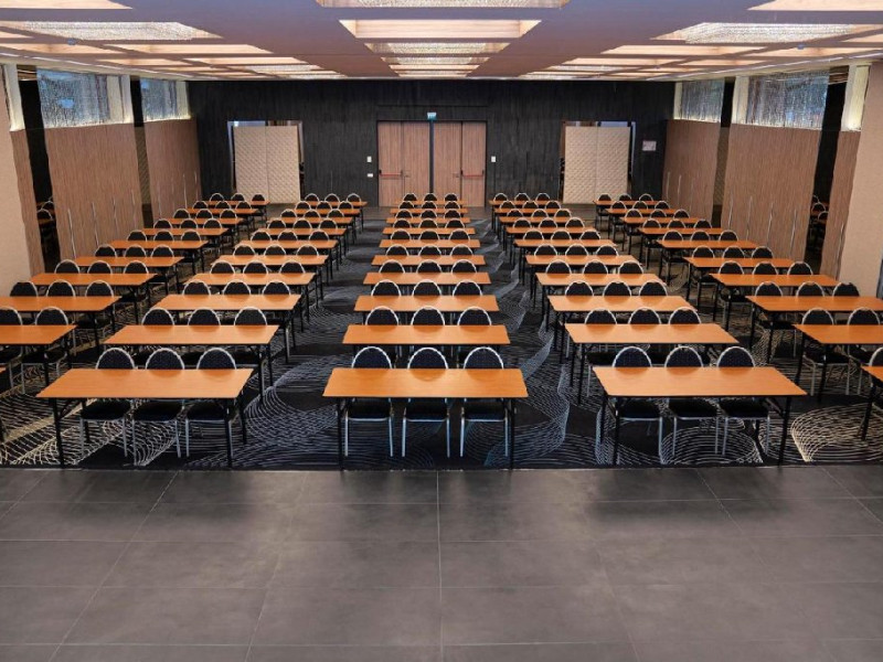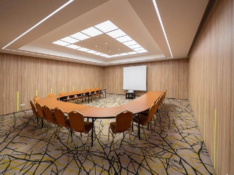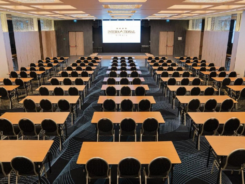 FACILITATI EVENIMENTE Sali de conferinta: 11 - cu o capacitate intre 20- 450 locuri, dotate cu: scaune cu masuta, desk-uri, flipchart-uri, retroproiectoare, ecrane proiectoare multimedia, table magnetice, panouri afisaj, copiator, telefon, fax, calculatoare, sistem de amplificare sunet, microfoane fixe si mobile, servicii secretariat.