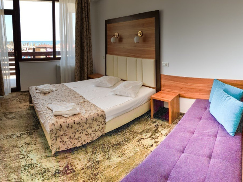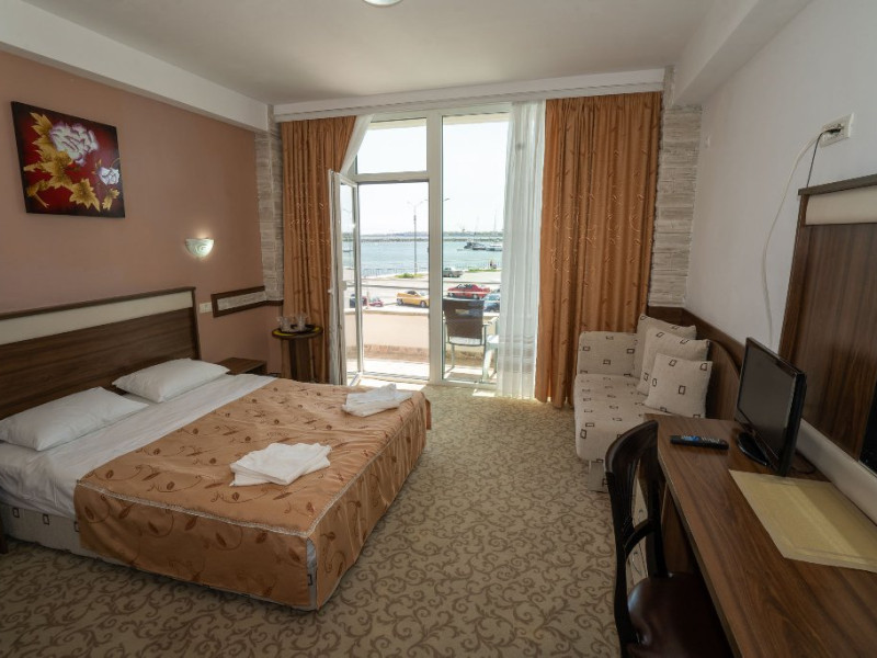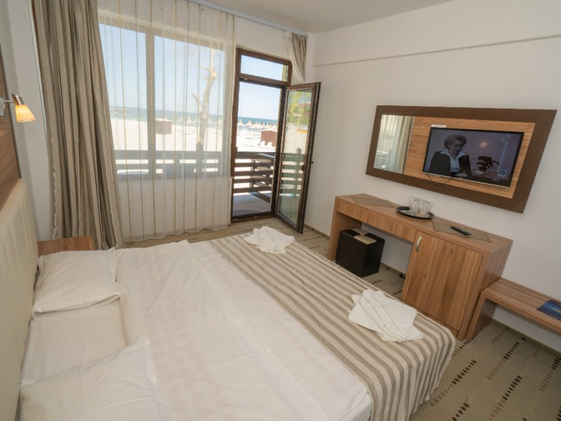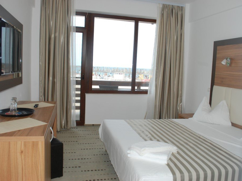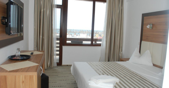 FACILITATI UNITATE Receptie, internet wirless gratuit, parcare publica cu plata. Hotelul ofera cazare in 38 camere duble dintre care 20 premium cu vedere la mare. Fiecare camera beneficiaza gratuit de 2 sezlonguri + umbrela aferenta, pe plaja hotelului.