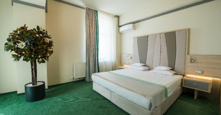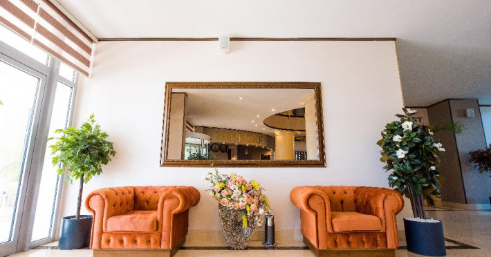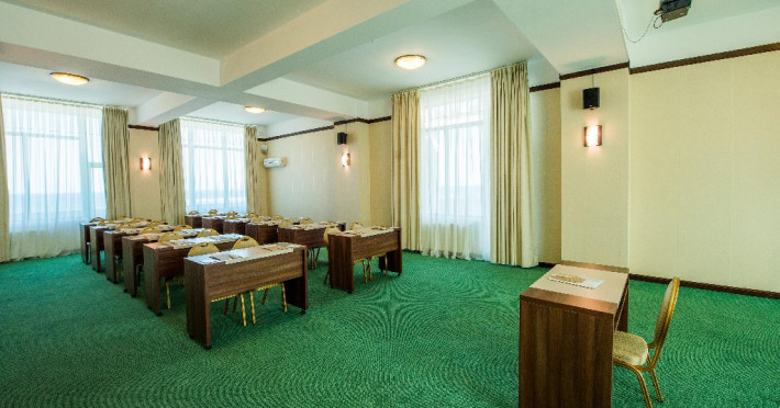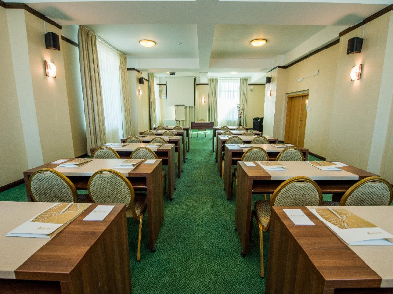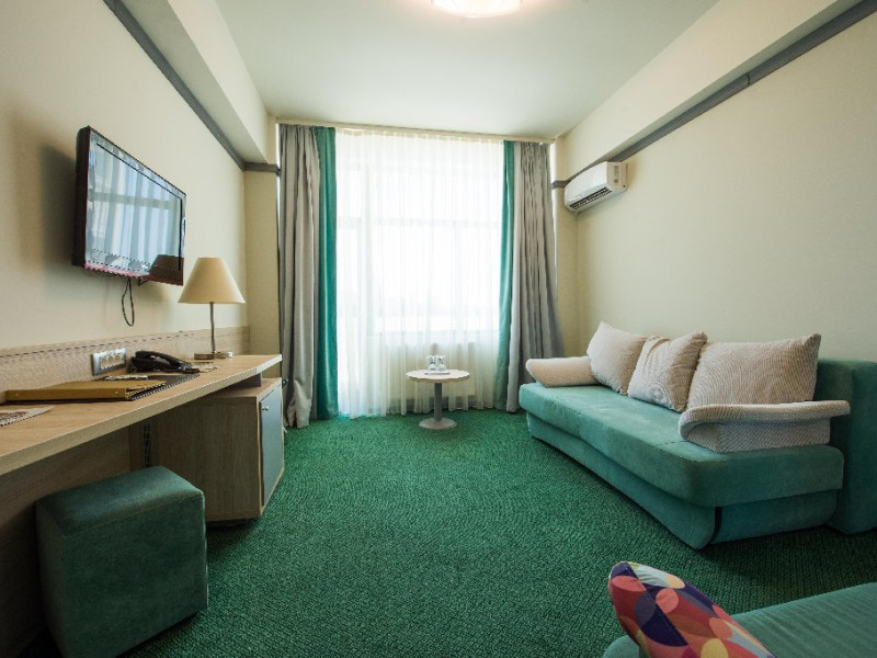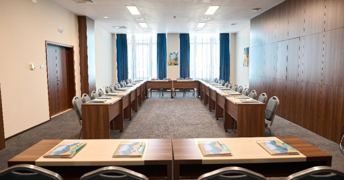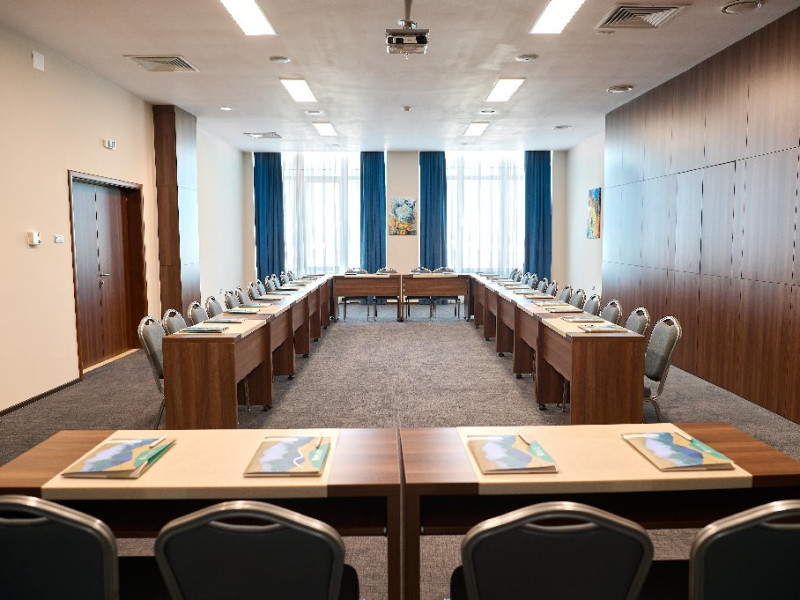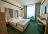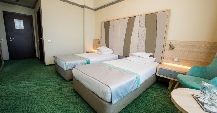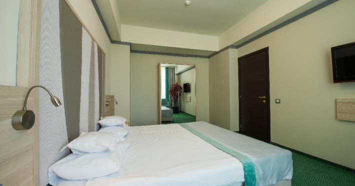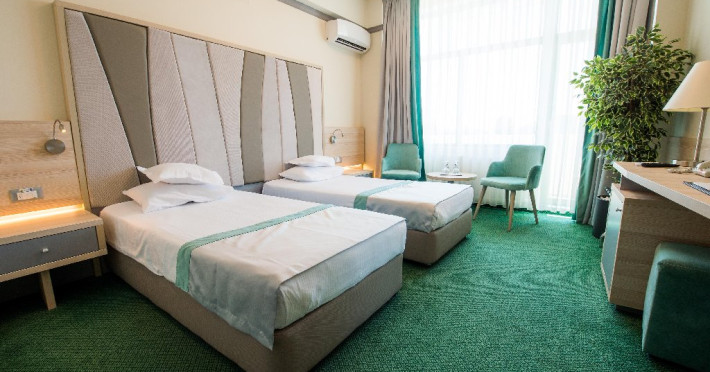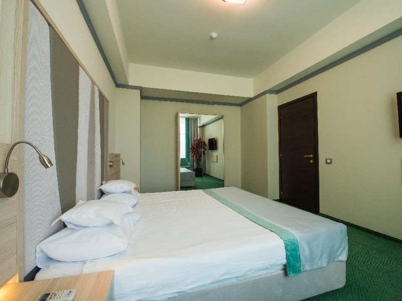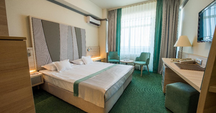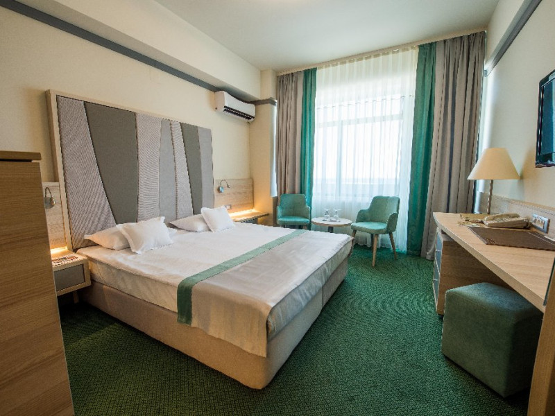 FACILITATI UNITATE Servicii incluse in tarif: - parcare in limita locurilordisponibile din perioada sejurului; - internet wireless in spatiile publice; -seif la receptie - pastrare bagaje la receptie; - curatenie in camera - zilnic;- schimbare lenjerie de pat; - schimbare prosoape - zilnic; - sauna umeda si uscata; - loc de joaca pentru copii amenajat in interior cat si pe plajadeschise in functie de program, sezon si conditii meteo; - plaja privata deschisa in functie de sezon si conditii meteo; -sezlonguri si umbrela pe plaja (maximum 2 sezlonguri si 1 umbrela/camera),in limita locurilor disponibile si in functie de sezon si conditii meteo - piscine exterioare(1 picina pentru adulti cu dancime intre 1.20-1.50m, 1 piscina pentru copii cu adancime de 0.50m). Servicii contra-cost: - restaurant cu specific international; -lobby bar; - servicii de spalatorie; - servicii decalcatorie; - 4 sali de conferinte cu o capacitate cuprinsa intre 34 si 250 locuri. DESCRIERE CAMERE Toate spatiile de cazare sunt prevazute cu: balcon, aer conditionat individual, LED TV, televiziune prin cablu, Wi-Fi, telefon, seif, mini-bar(contra cost), baie cu cabina de dus, uscator de par, prosoape, halate de baie si papuci. Numar total camere: 153 - Dintre aceste camere, 22 suntapartamente, 78 sunt camere twin, iar 53 sunt camere cu pat matrimonial. Apartamentul este compus din living cu canapea extensibilasi dormitor, balcon sau terasa.