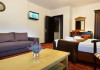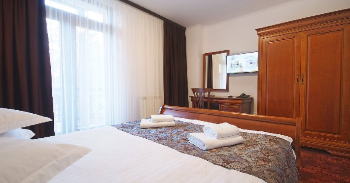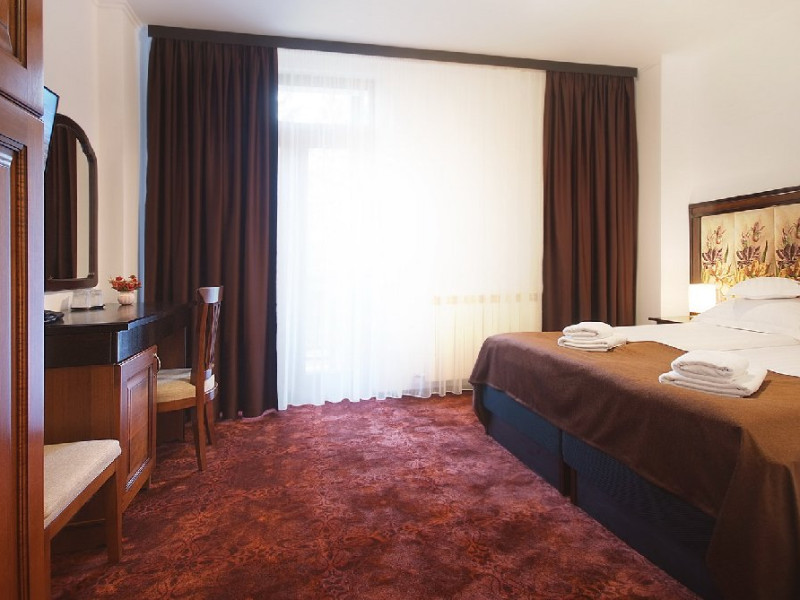 Camera Dubla Superioara. Cu o suprafata de aproximativ 21 mp, cu un mobilier elegant, camera Dubla Superioara va ofera pat matrimonial, balcon privat cu priveliste deosebita si dimensiune generoasa, WI - FI gratuit si baie cu dus.