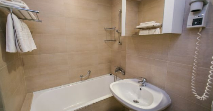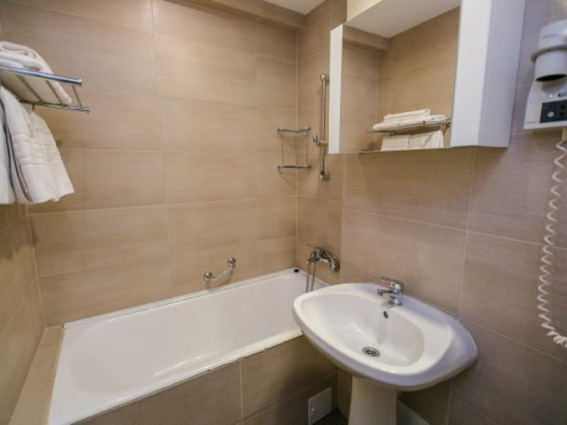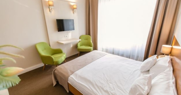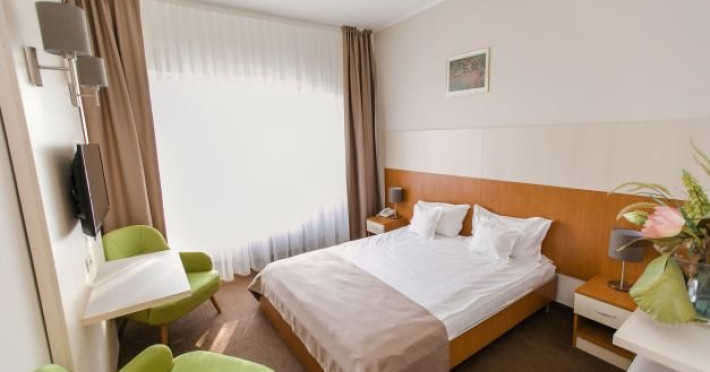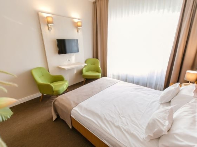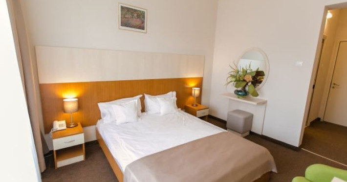 DESCRIERE CAMERE:Hotelul are 68 camere duble, unele camere au balcon, sunt 4 camere single si 4 apartamente. Camerele duble au ca dotare pat matrimonial sau twin, mocheta, aer conditionat, doua fotolii, tv, telefon, minibar, internet Wi-Fi, baie cu cada, uscator de par. Halatele de baie si papuci de camera sunt in fiecare camera.