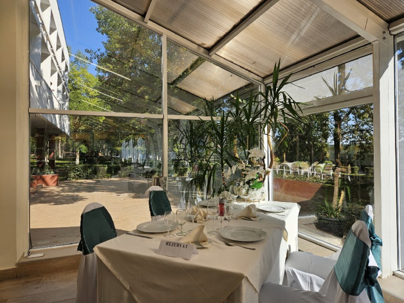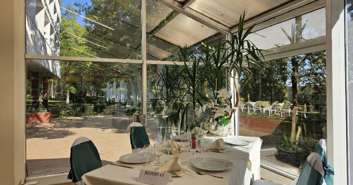 SERVICII DE MASA: Se acorda in restaurantul propriu cu 140 locuri, 48 locuri pe terasa acoperita si inca 40 locuri pe terasa descoperita in sezon. Micul dejun si cina se servesc sub forma de bufet suedez tot anul, pranzul a la carte in extrasezon in valoare de 70 Lei/zi/adult/ copil peste 12 ani si 41 Lei (in anul 2025) si 44 Lei (in anul 2026) /zi/copil 2-12 ani si bufet suedez in sezon (15.06-31.08). In cadrul sejururilor cu pensiune completa sau demipensiune, intrarea se face cu cina in ziua de check-in si iesirea cu mic dejun in ziua de check out.