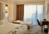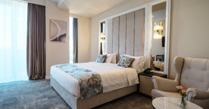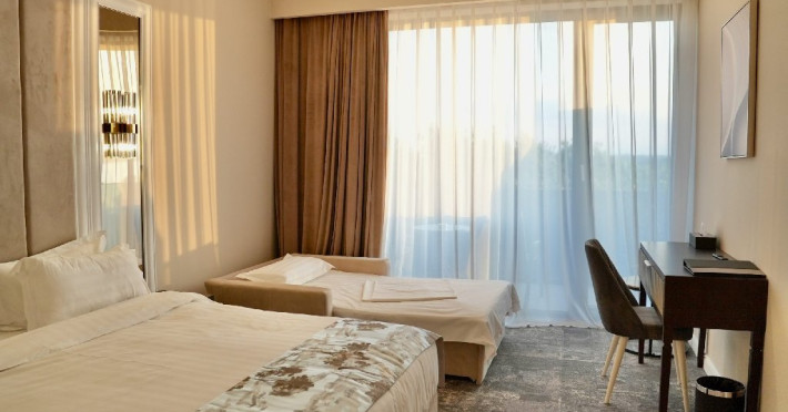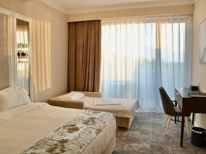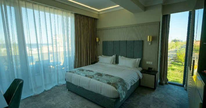 Camera dubla deluxe Camera dubla deluxe la Hotel Panoramic din Mamaia ofera o experienta unica, fiind dotata cu birou si canapea extensibila (110 cm x 190 cm). Spatiul: Camerele sunt spatioase, cu o suprafata de 34 metri patrati, si sunt mobilate cu un pat dublu, confortabil-king size si dressing generos.